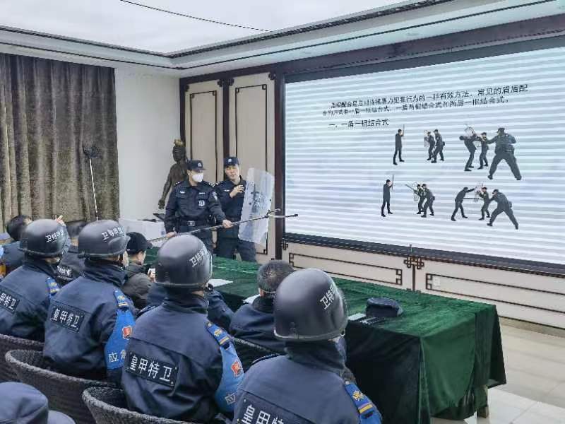 2023年2月16日下午在治未病中心举行防暴恐培训演练,在模拟实战中寻找差距,最大限度的减少因突发事件造成的人员伤害,确保我院内部的职工和患者的人身安全。特警支队民警从医院实际情况出发,采取边讲解、边示范,互动穿插的方法,培训了防暴棍、钢叉、防爆盾等防暴器材的使用技巧,面对突发暴力事件的先期处置和疏散办法。安保人员与特警支队民警现场交流,亲身体验各种突发暴力事件的应对技巧,掌握了盾牌、防暴棍等器材的使用技能,为医院做好应急处突工作打下坚实基础。