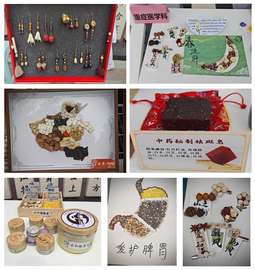中医文创文化节作为本次活动的一大亮点,汇聚了全院24 个临床科室的智慧与创意。各科室结合专科特色,推出数十种兼具文化内涵与实用价值的中医文创作品:中药香囊、中药饰品、中药护手蜜、药皂、中药冰箱贴、中药标本创意画、养生茶等琳琅满目。这些作品不仅充分展现了中医药文化的深厚底蕴,更凸显了护理团队的创新精神,为传统中医药注入了全新活力。