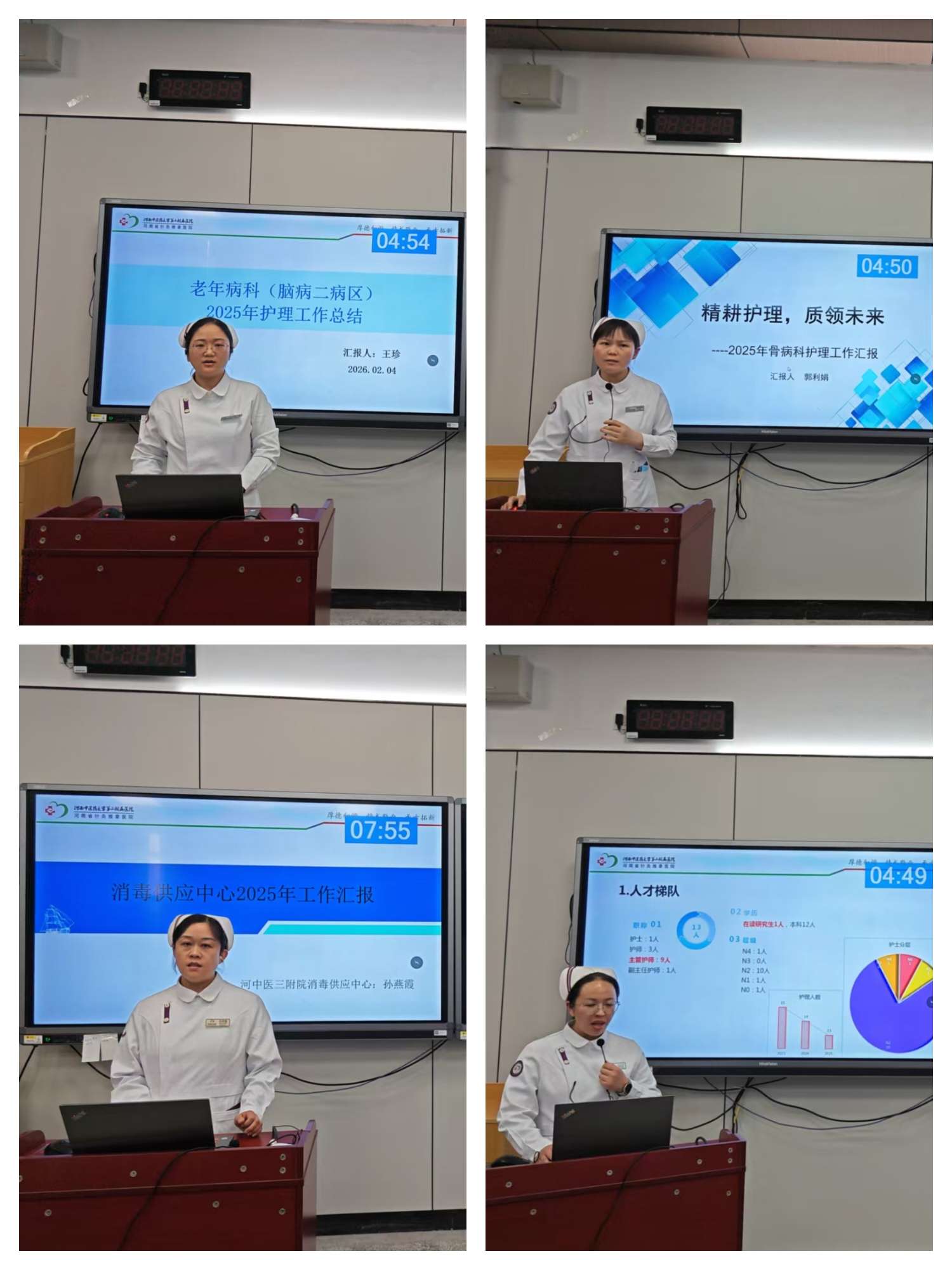 会上,37名护士长围绕2025年度护理管理、质量安全、服务创新、团队建设等内容进行汇报,客观总结成效、剖析存在问题,并阐述2026年重点工作计划。静脉治疗、糖尿病、火龙罐等18个专科小组组长也分别就培训开展、质控管理、学术交流等方面进行总结,明确新一年专科发展重点。