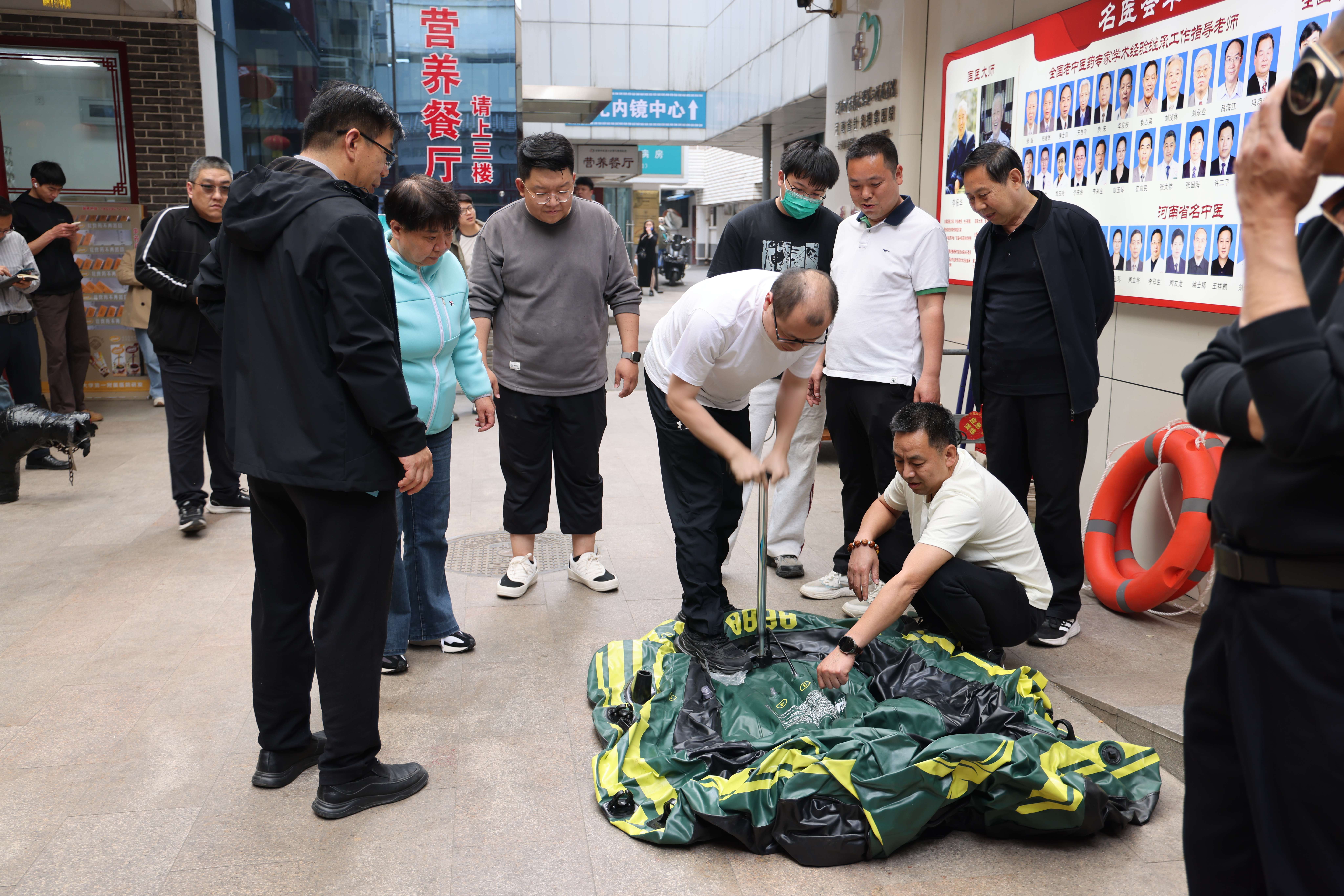 此次演练模拟近日连续大雨,导致某河河水溢出,某路雨水向急诊门倒灌,导致急诊停电,院内积水较深,急需封堵急诊门,保障急诊楼供电,排除院内积水,并紧急排涝、应急疏散、溺水救治。