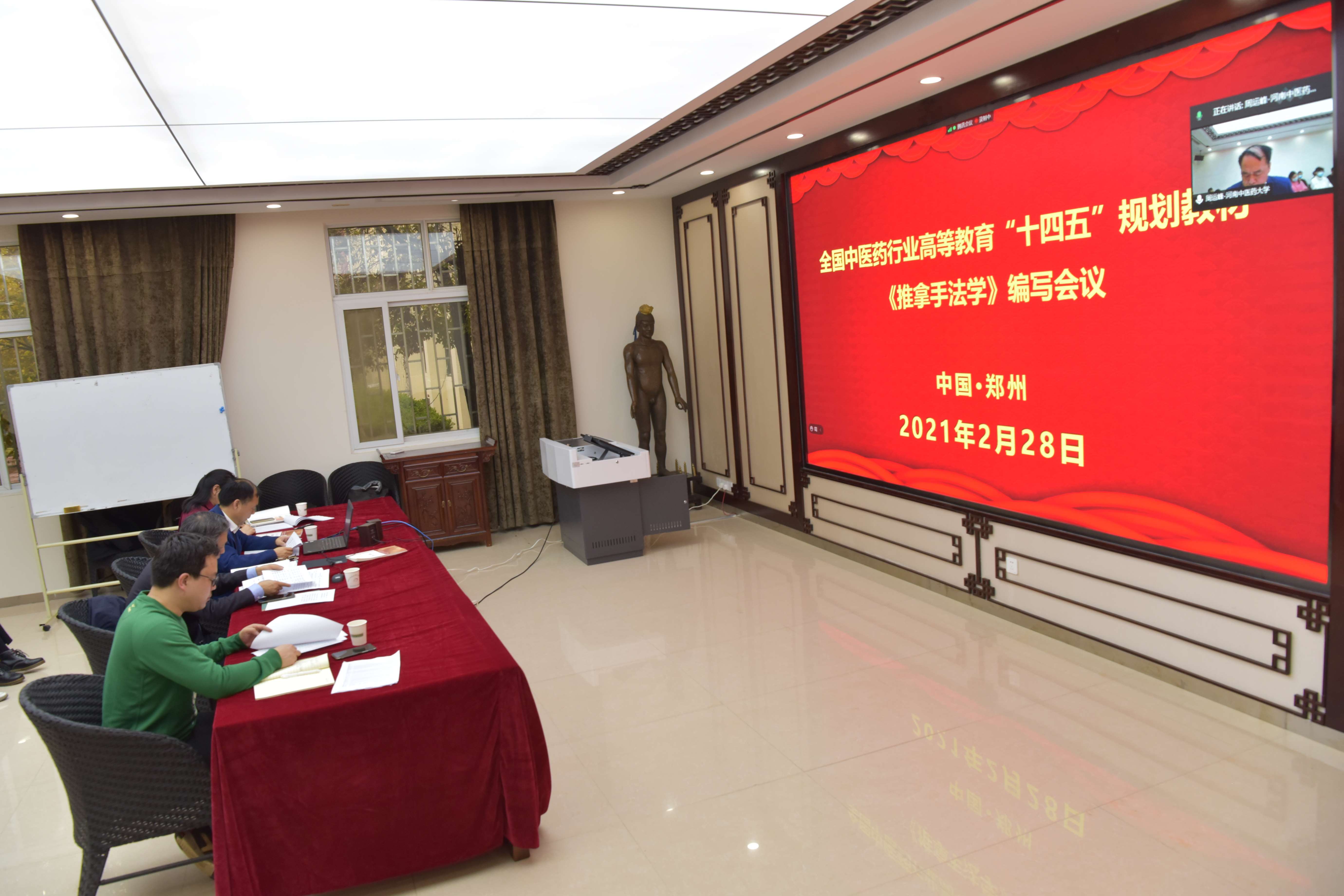 本网讯(文/胡兴旺 图/田辉) 2月28日下午,全国中医药行业高等教育“十四五”规划教材《推拿手法学》编写会在我校召开。来自全国29个高等医学院校的32位专家参加了线上会议。校党委委员、副校长徐江雁出席并讲话。