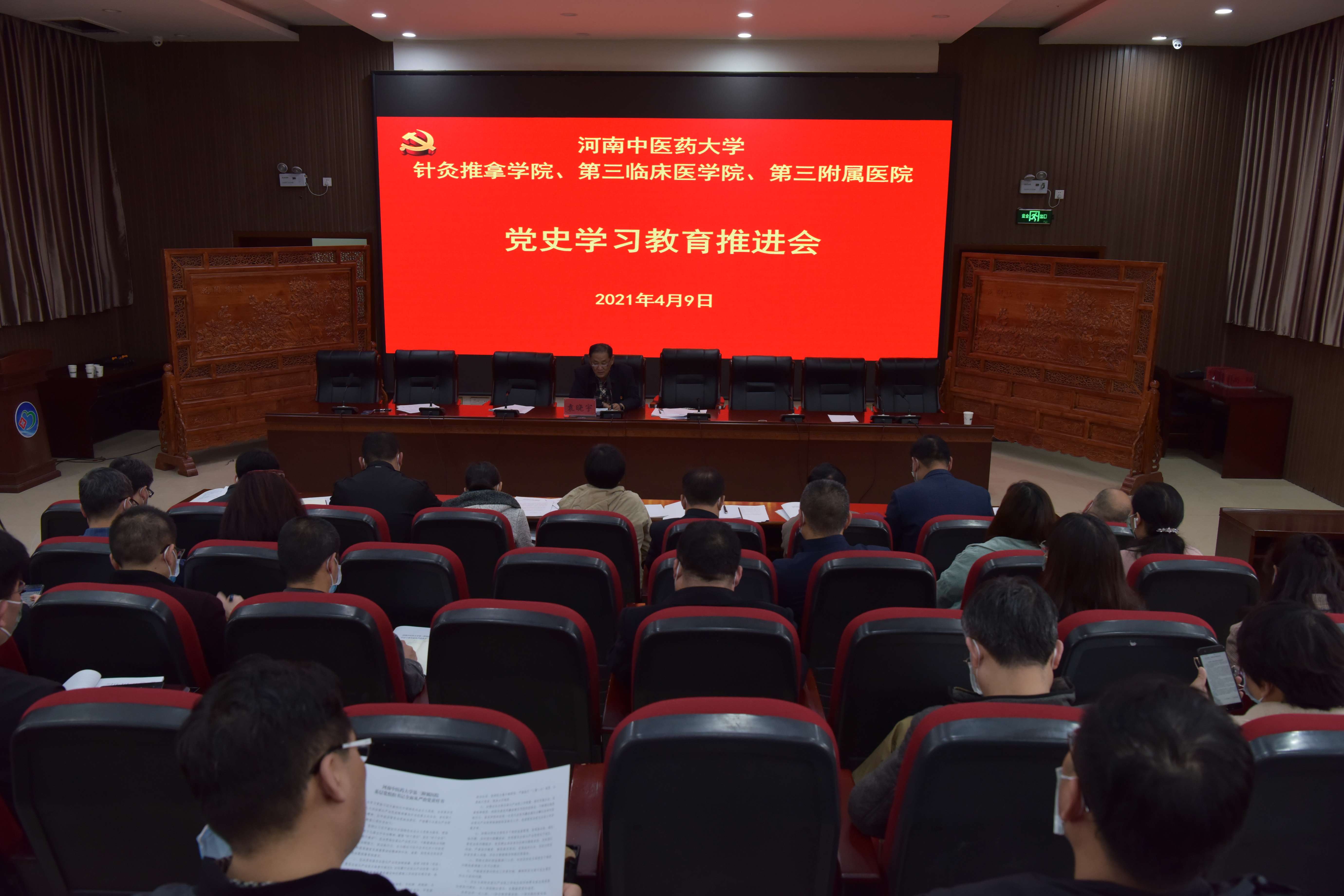 会议传达了学校党史学习教育推进会精神和院党委书记周运峰对党史学习教育推进会指导要求。集中学习了《中共河南中医药大学第三附属医院委员会关于开展党史学习教育工作方案》,对各党总支、各支部党史学习教育工作进行了学习部署。