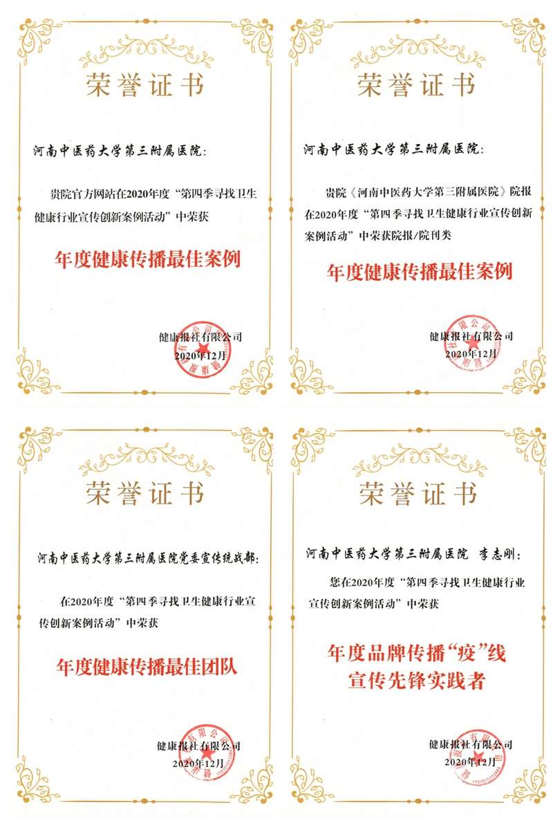 在“第四季寻找卫生健康行业宣传创新案例活动”颁奖仪式上,我院报送的案例荣获4项殊荣,分别是2020年度“院刊院报类年度健康传播最佳案例”“官方网站类年度健康传播最佳案例”;党委宣传统战部荣获“年度健康传播最佳团队”、党委宣传统战部部长李志刚荣获“年度品牌传播“疫”线宣传先锋实践者”。