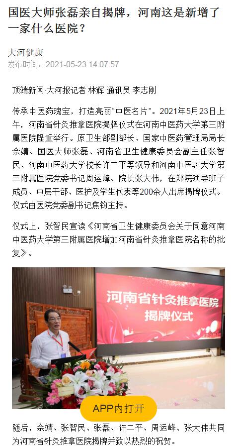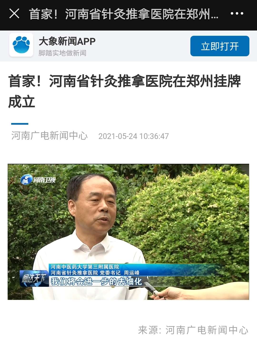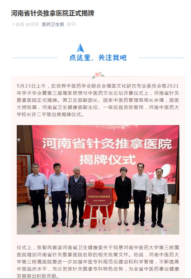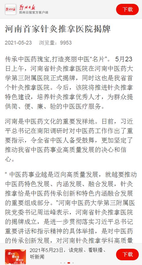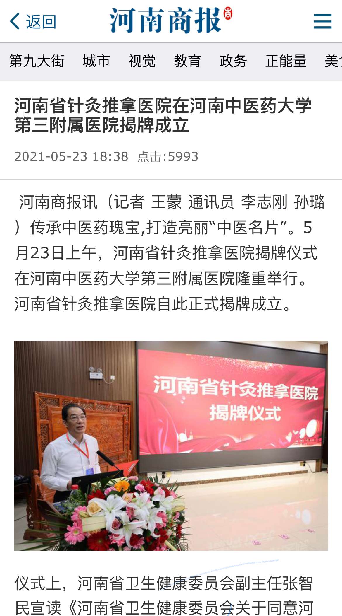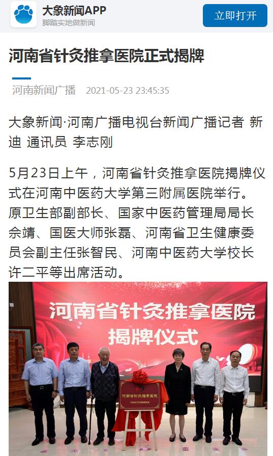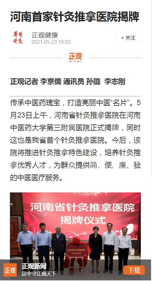 编者按: 传承中医药瑰宝,打造亮丽“中医名片”。2021年5月23日上午,河南省针灸推拿医院揭牌仪式在我院隆重举行。河南日报客户端、郑州日报、医药卫生报、河南电视台等省会十多家媒体纷纷报道。