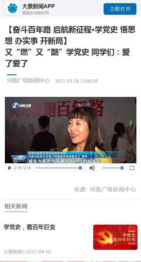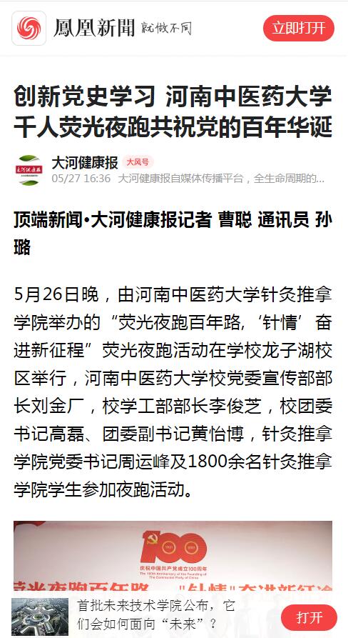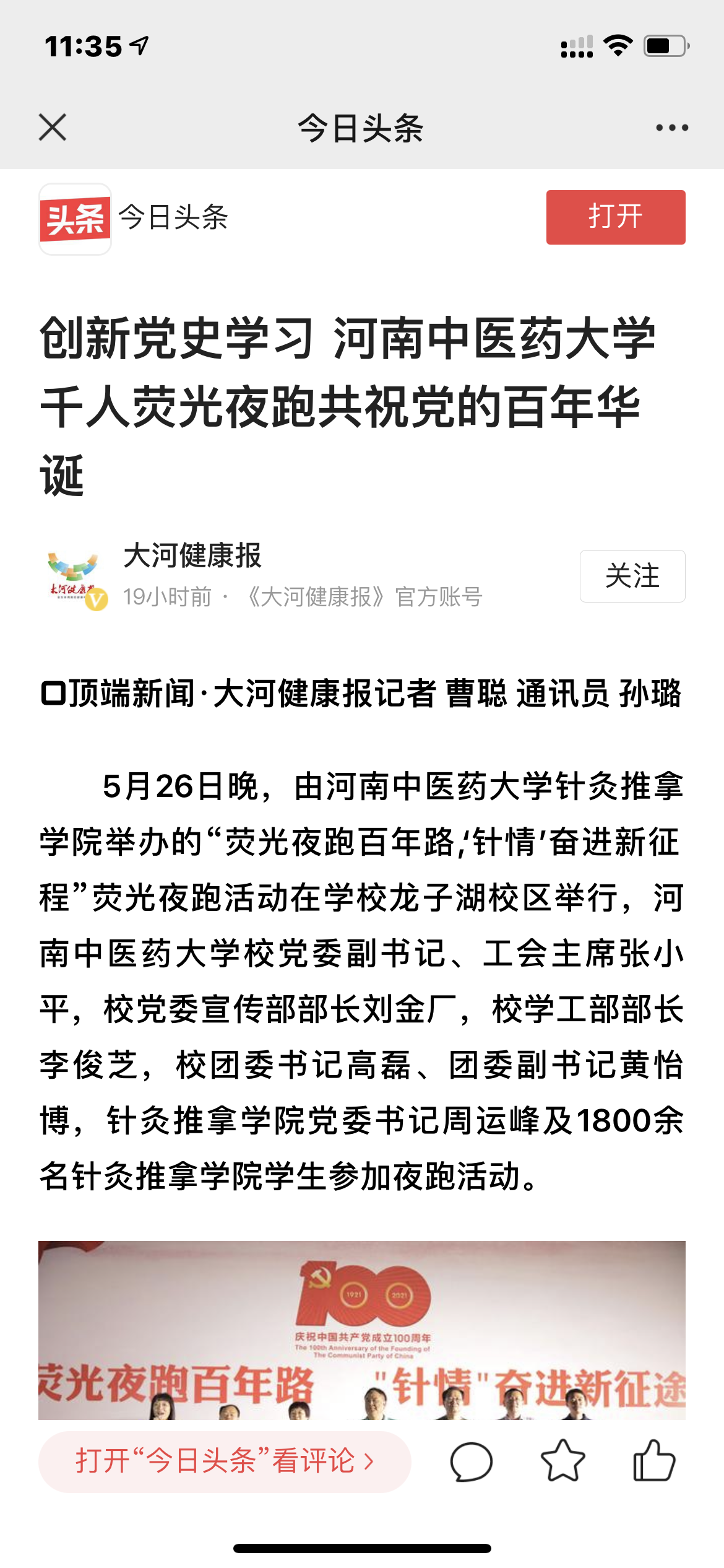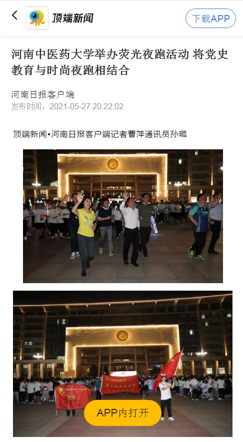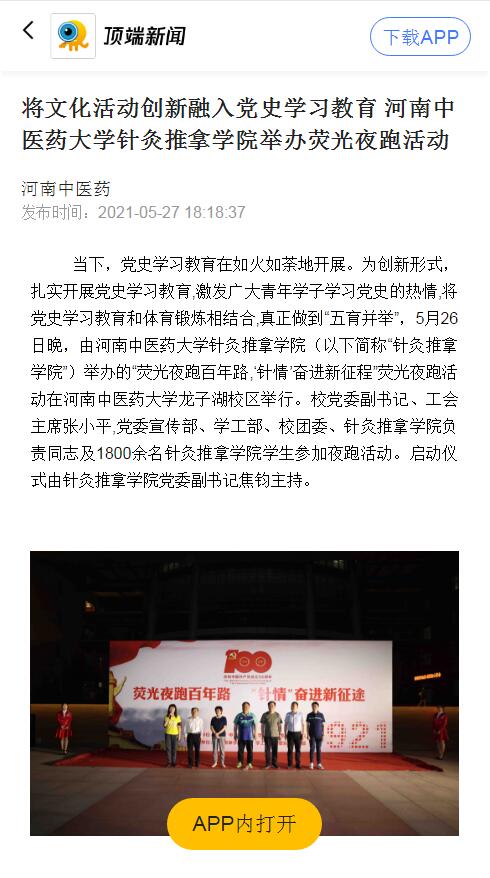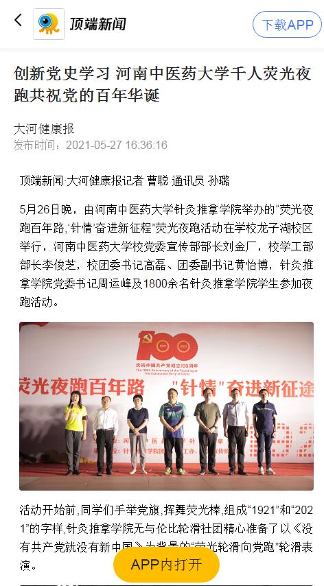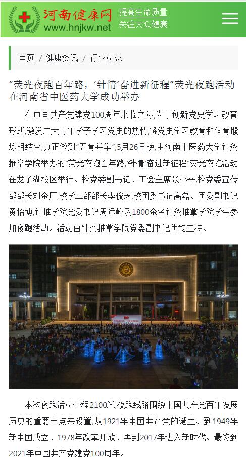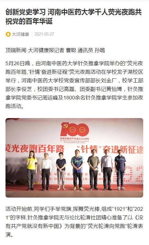 编者按: 5月26日,河南中医药大学针灸推拿学院成功举办“荧光夜跑百年路,‘针情’奋进新征程”荧光夜跑活动,创新党史学习教育形式,激发广大青年学子学习党史的热情,将党史学习教育和体育锻炼相结合,真正做到了“五育并举”,对此,省内多家媒体进行报道。
