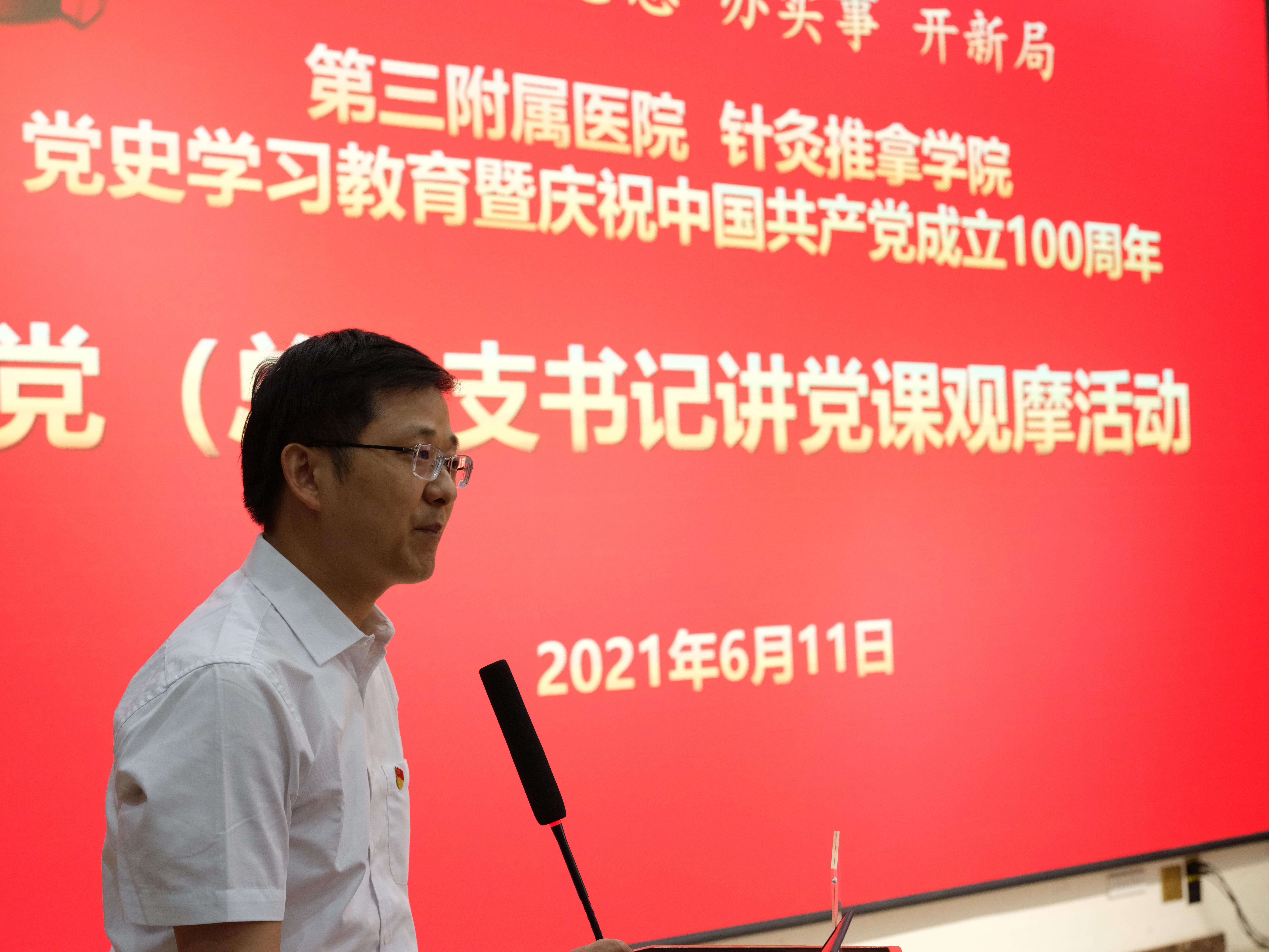 本网讯(通讯员胡兴旺 郑楠楠 图田辉) 2021年6月11日下午,我院在医院学术活动中心举办了“学思践悟我带头 争当基层好书记”党史学习教育暨庆祝中国共产党成立100周年党(总)支书记讲党课观摩活动。为高质量开展党(总)支部书记讲党课工作,特邀校党委宣传部副部长蔡信强、党委组织部副处级组织员李琳到会指导。我院党委副书记陶洁、党委副书记焦钧、纪委书记刘会勋和工会主席蔡庆春以及新老党员、积极分子代表参加了活动。