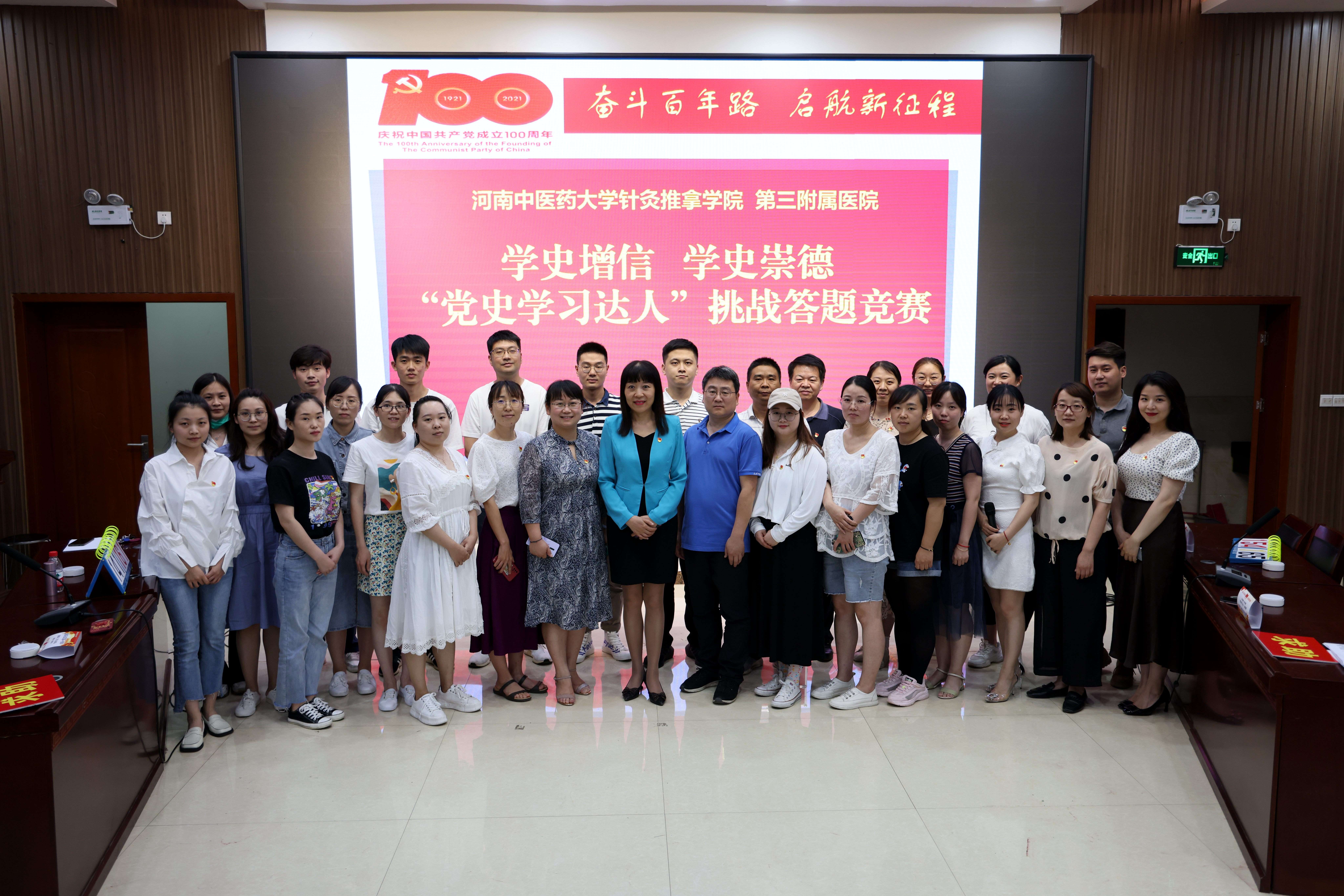 本网讯(通讯员孙璐 图田辉 潘向昆) 为庆祝中国共产党成立100周年,进一步营造党史学习教育的浓厚氛围,提高广大党员积极践行学党史、悟思想、办实事、开新局的思想认识,掀起新的学习热潮,6月21日,由针推学院、三附院党史学习教育领导小组办公室主办,党委宣传统战部、精神文明办、团委、院工会承办的“学史增信·学史崇德‘党史学习达人’挑战答题竞赛”在我院学术中心成功举办。医院党委副书记焦钧出席活动并致辞讲话,各党总支、直属党支部选派的参赛选手及职工代表参加了活动。活动由青年党员郭伟、王若田主持。