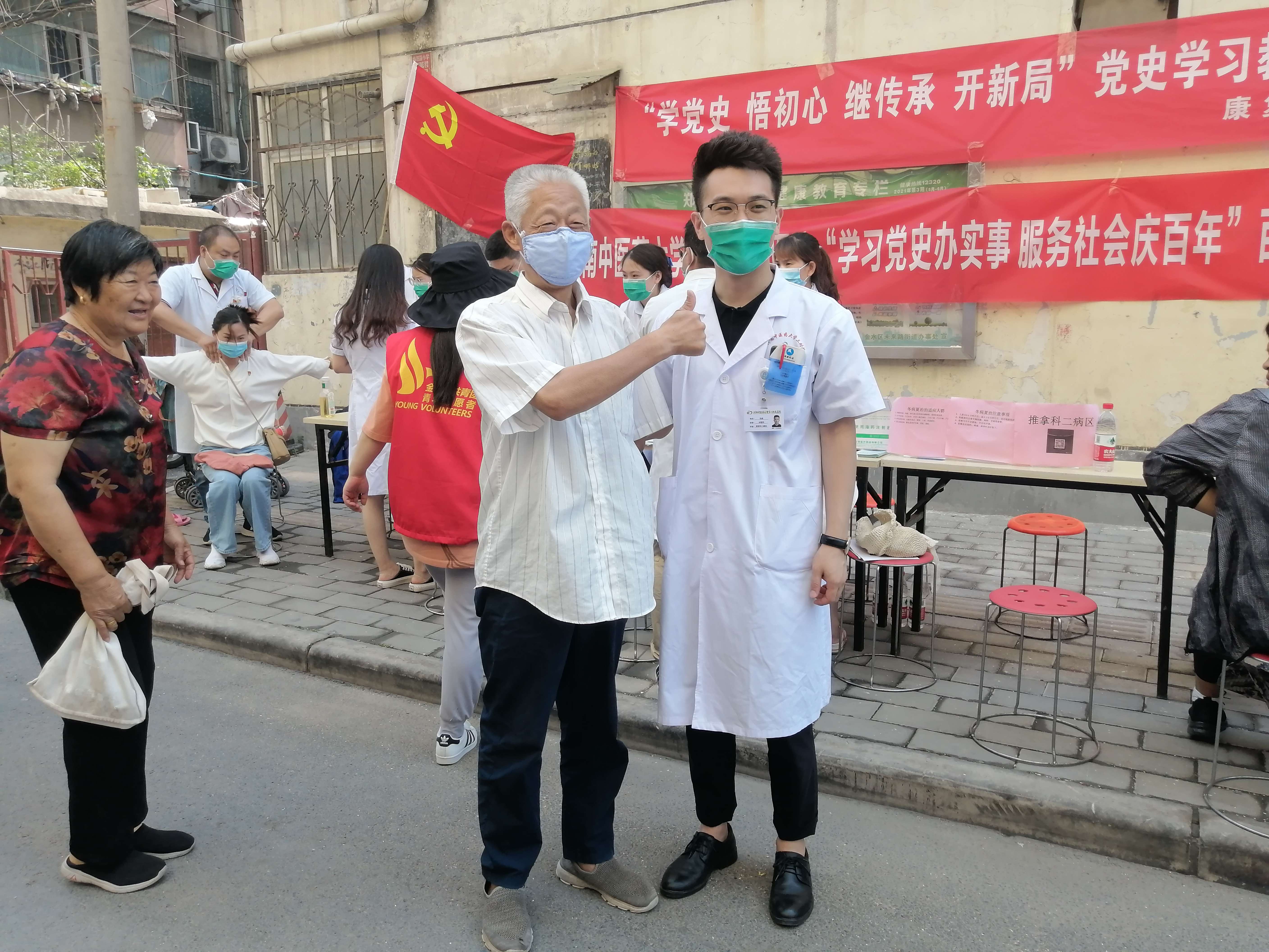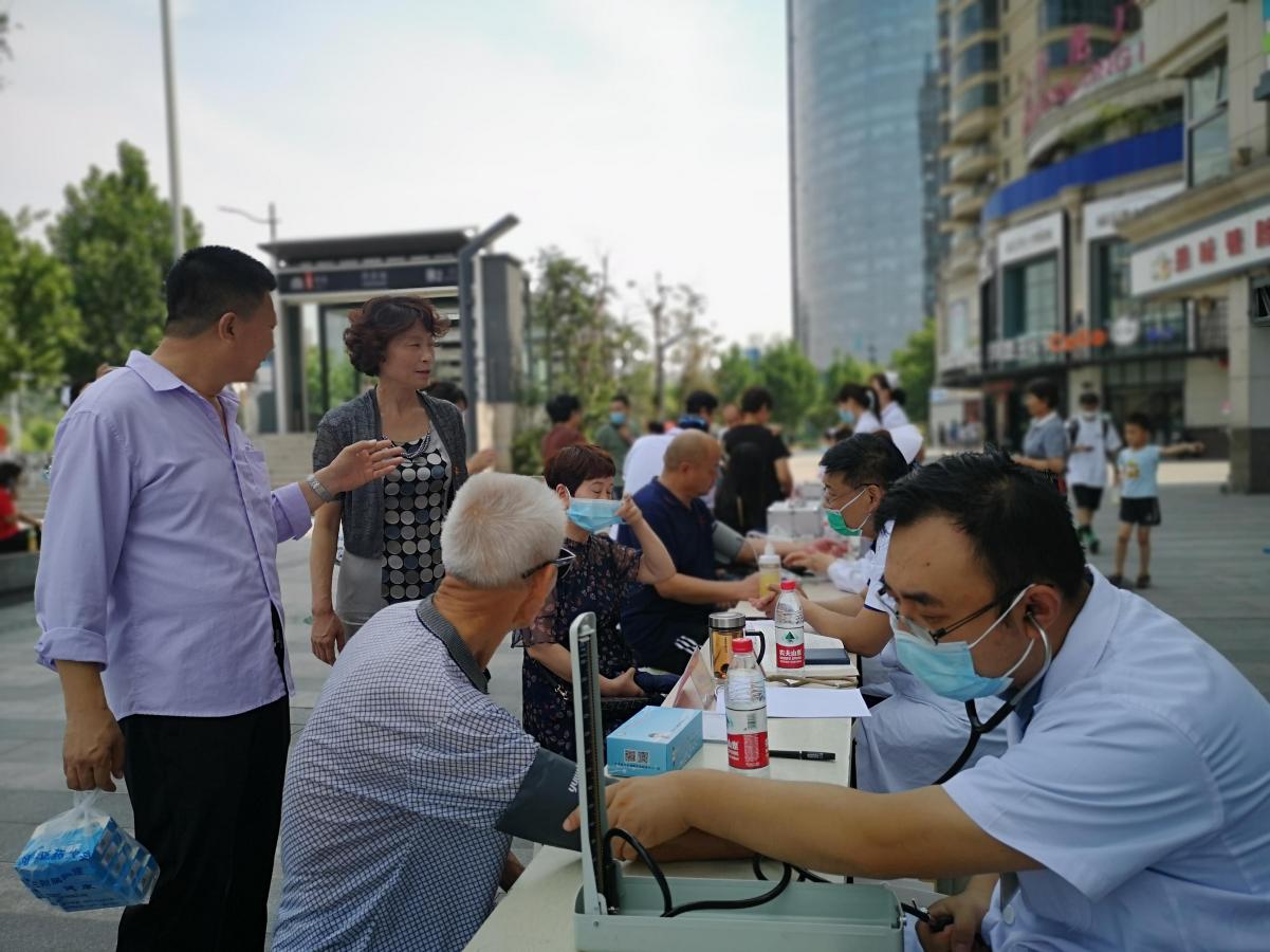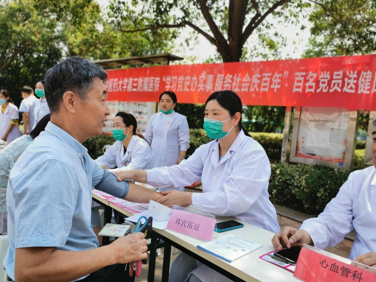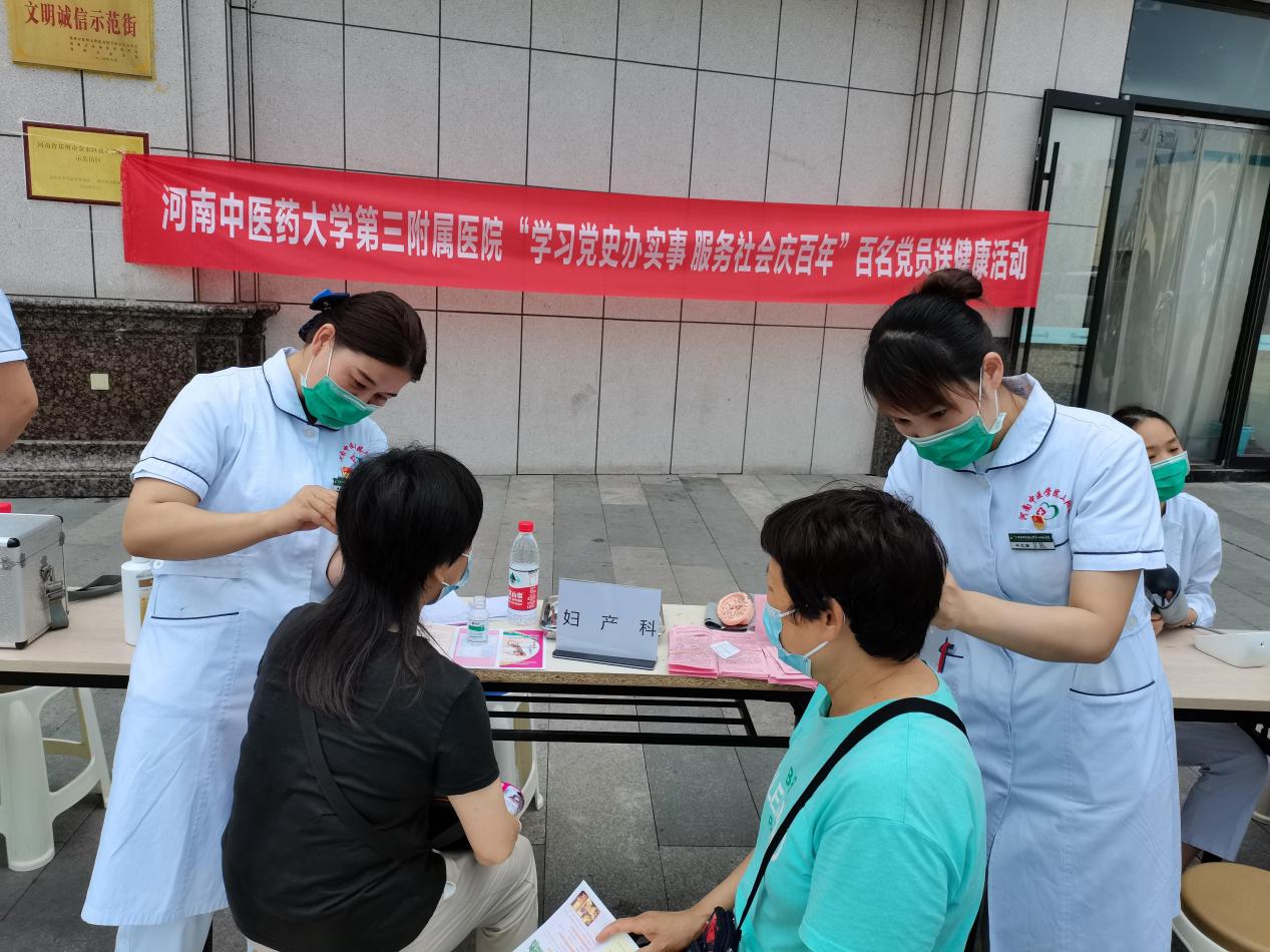 在曼哈顿升龙广场,党委办公室副主任胡兴旺和校级样板党支部、河南省优秀党务工作者李志刚带领18名党员为群众把脉问诊、遣方用药和健康指导;在启新里社区,12名党员为群众们开展了推拿、针灸、刮痧、拔罐、艾灸、三伏贴、耳穴贴压等中医特色疗法。带领群众做米字操、头手对抗操,提升群众健康运动意识;在银基花园社区,医院专家们为社区群众测量血压、穴位贴敷,对夏季常见病、多发病进行健康科普和用药咨询。向群众发放“静音广场舞、规范暴走团、文明健步走”倡议书,引导群众加强自律,文明健身,营造文明和谐、绿色环保健康的社会氛围;在阿卡迪亚社区,一位年轻的高血压患者,在疼痛科王东阳医生的针灸治疗后血压由来时的159/117mmhg降到148/102mmhg,患者头晕不适症状立刻轻。群众们对中医疗法赞不绝口;在银河丹堤社区,党员们对社区内三家孤寡老人进行送医上门服务,在社区工作人员陪同下对孤寡老人进行了身体检查,并嘱咐用药事项。王亚春护士长为群众演示了心肺复苏和海姆立克急救法以及120正确拨打方法等,受到了社区居民的欢迎和称赞;在我院东明路门口,前来问诊的患者络绎不绝。内分泌科主任赵璐、门诊办主任王炳恒等12名党员耐心地为患者答疑解忧、把脉诊疗、辨证施治。党员们为群众讲解了中医药相关的科普知识,指导群众运用中医药防控疫情和防治疾病。在巩义市敬老院,24名党员对身体不适的孤寡老人诊断治疗义诊,并以《口腔健康 身体健康》为题目开展了健康科普讲座。