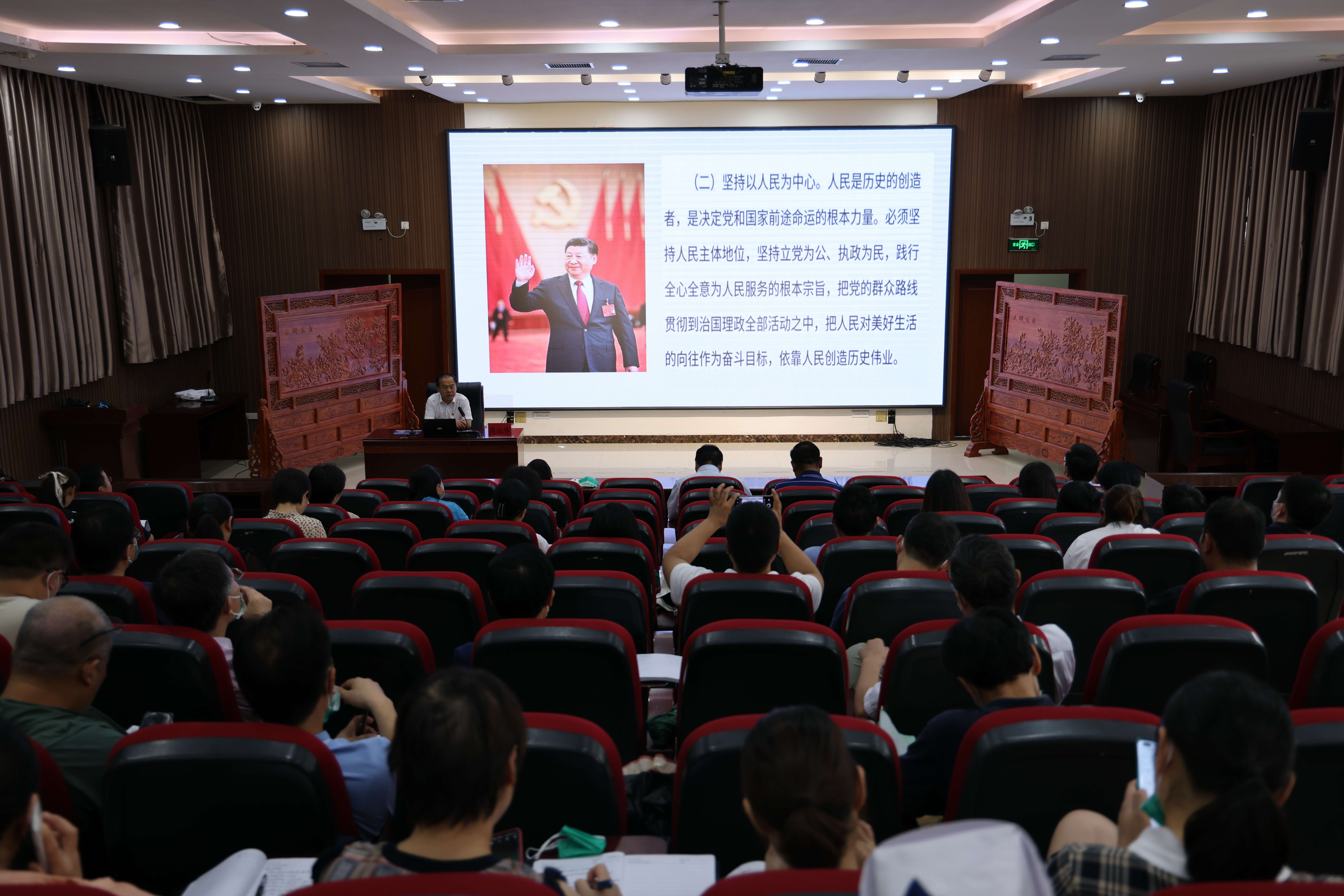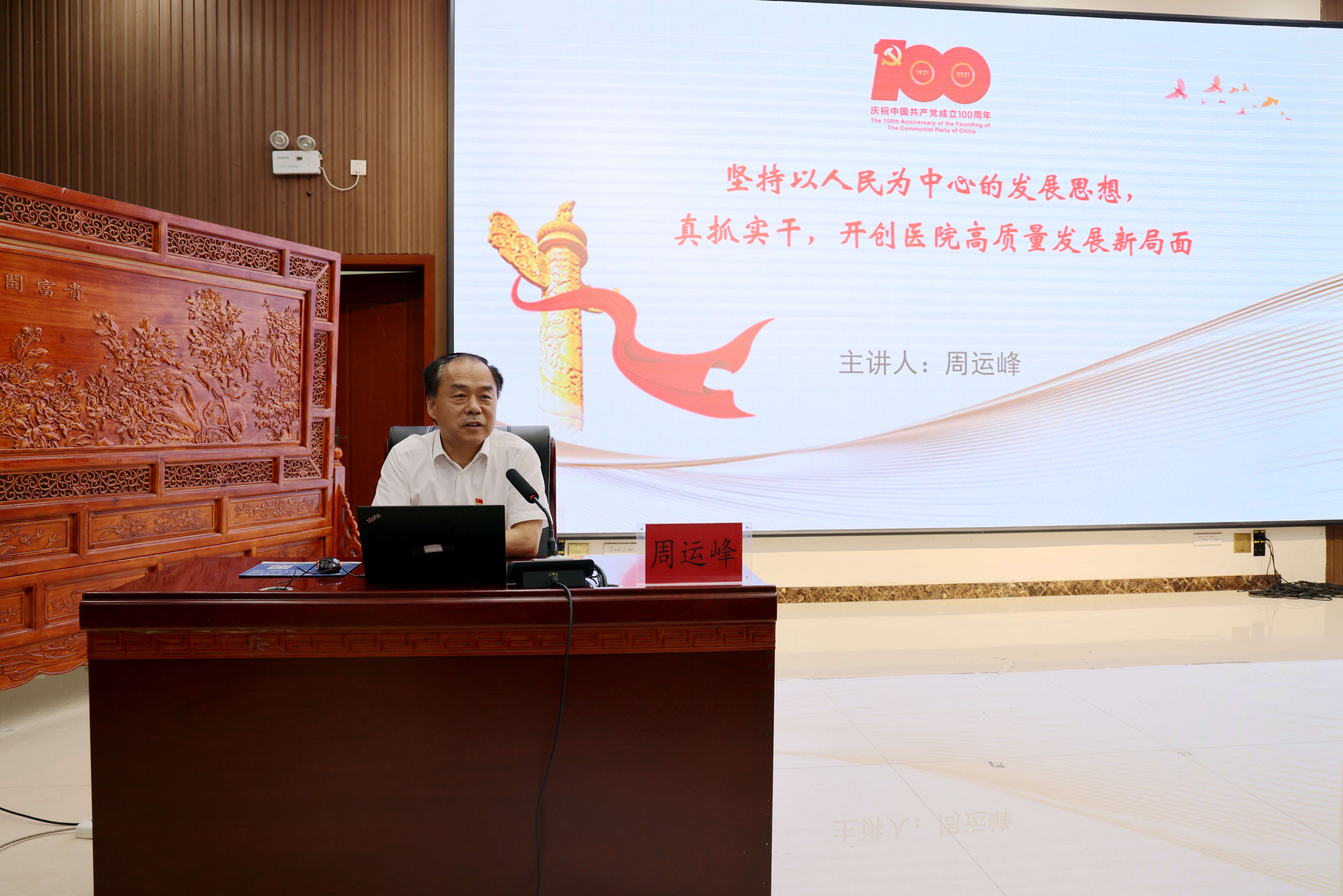 本网讯(通讯员胡兴旺 图潘向昆) 为深化开展党史学习教育,贯彻落实习近平总书记在南阳考察调研时的重要讲话精神,2021年6月25日下午,院党委书记周运峰以《坚持以人民为中心的发展思想,真抓实干,开创医院高质量发展新局面》为题,在学术活动中心为全院党(总)支部书记、全体中层干部和护士长150余人上了专题党课,在郑院领导参加。他从“跟着总书记学做人、跟着总书记学做事和跟着总书记学学习”三个方面进行了重点讲述。