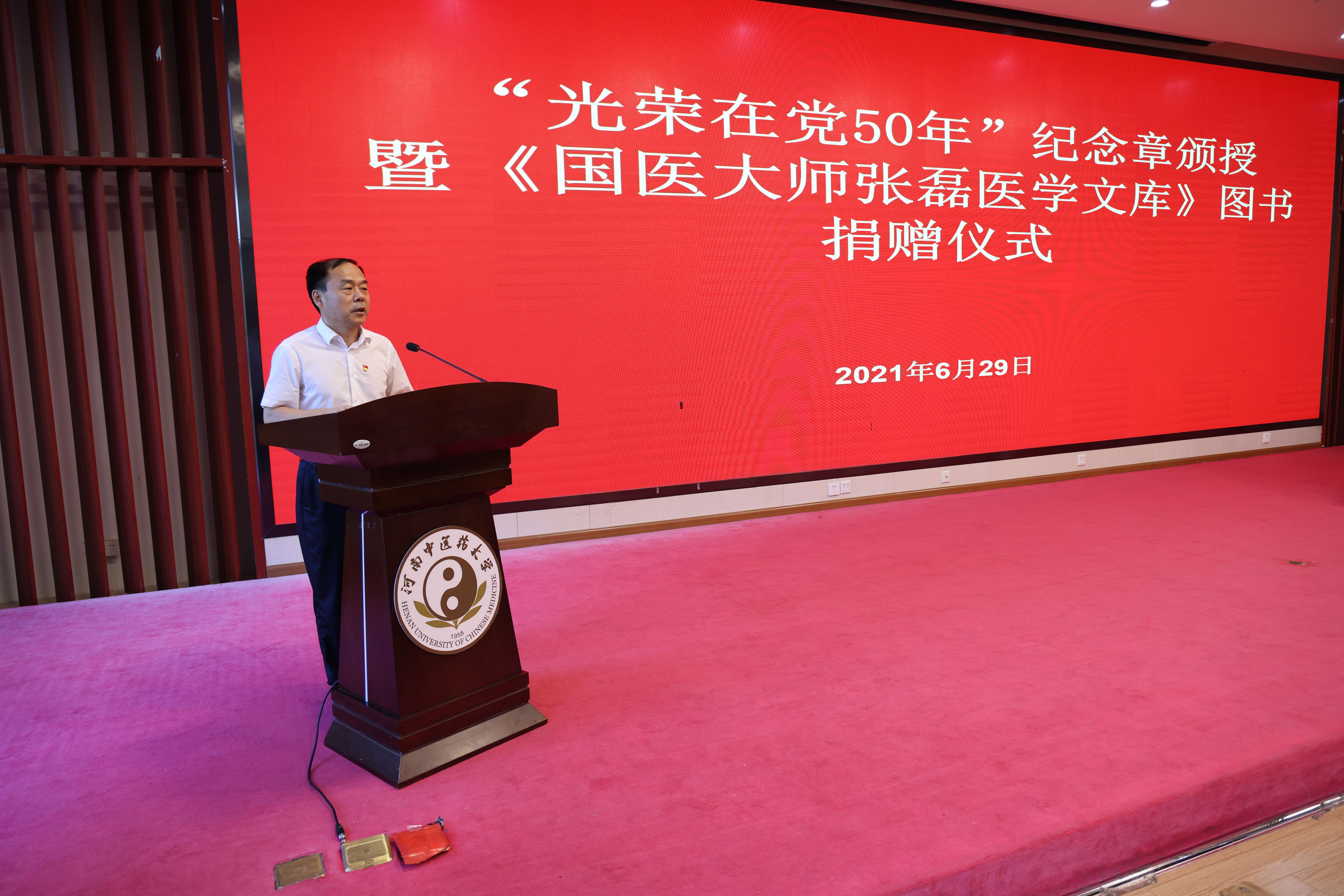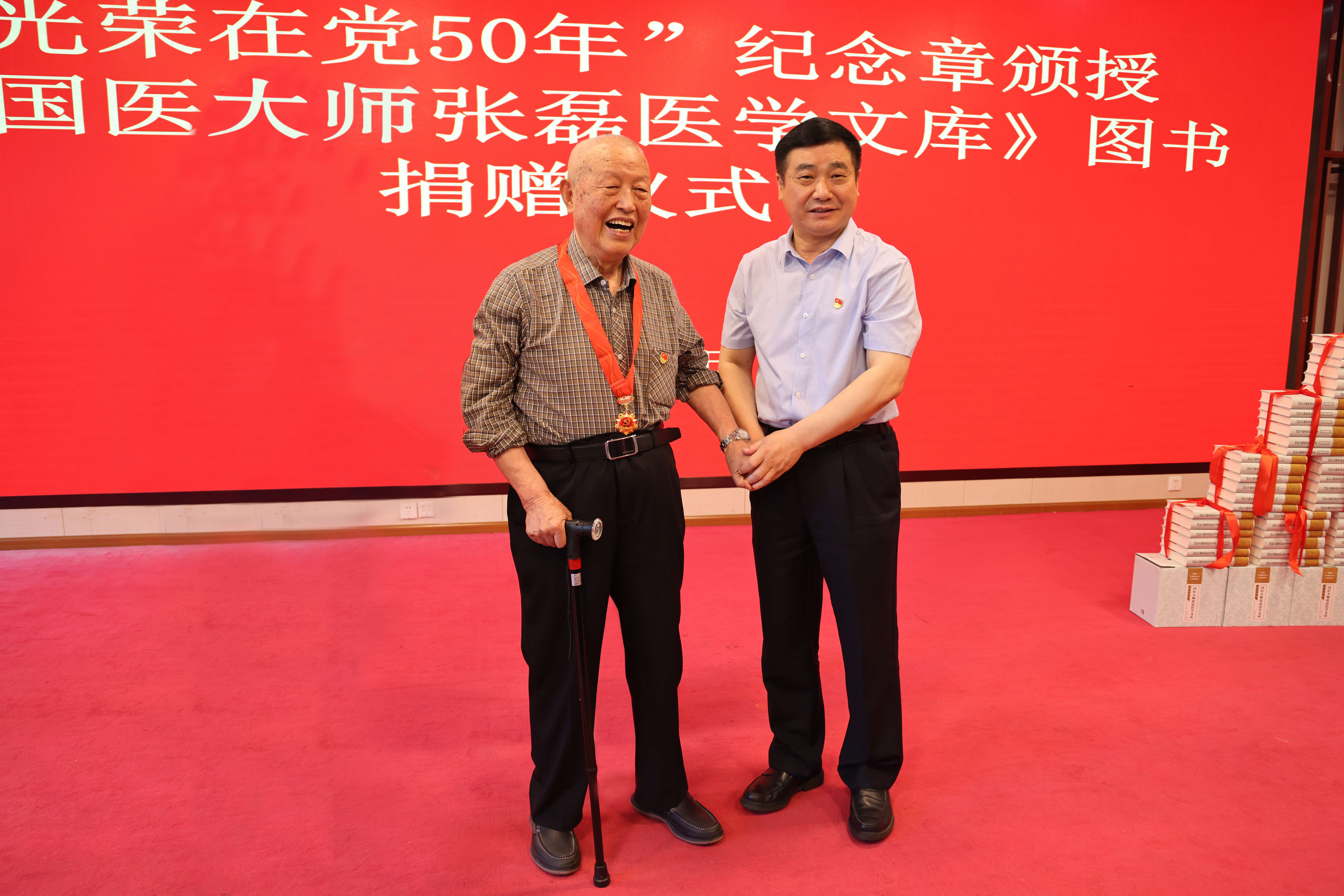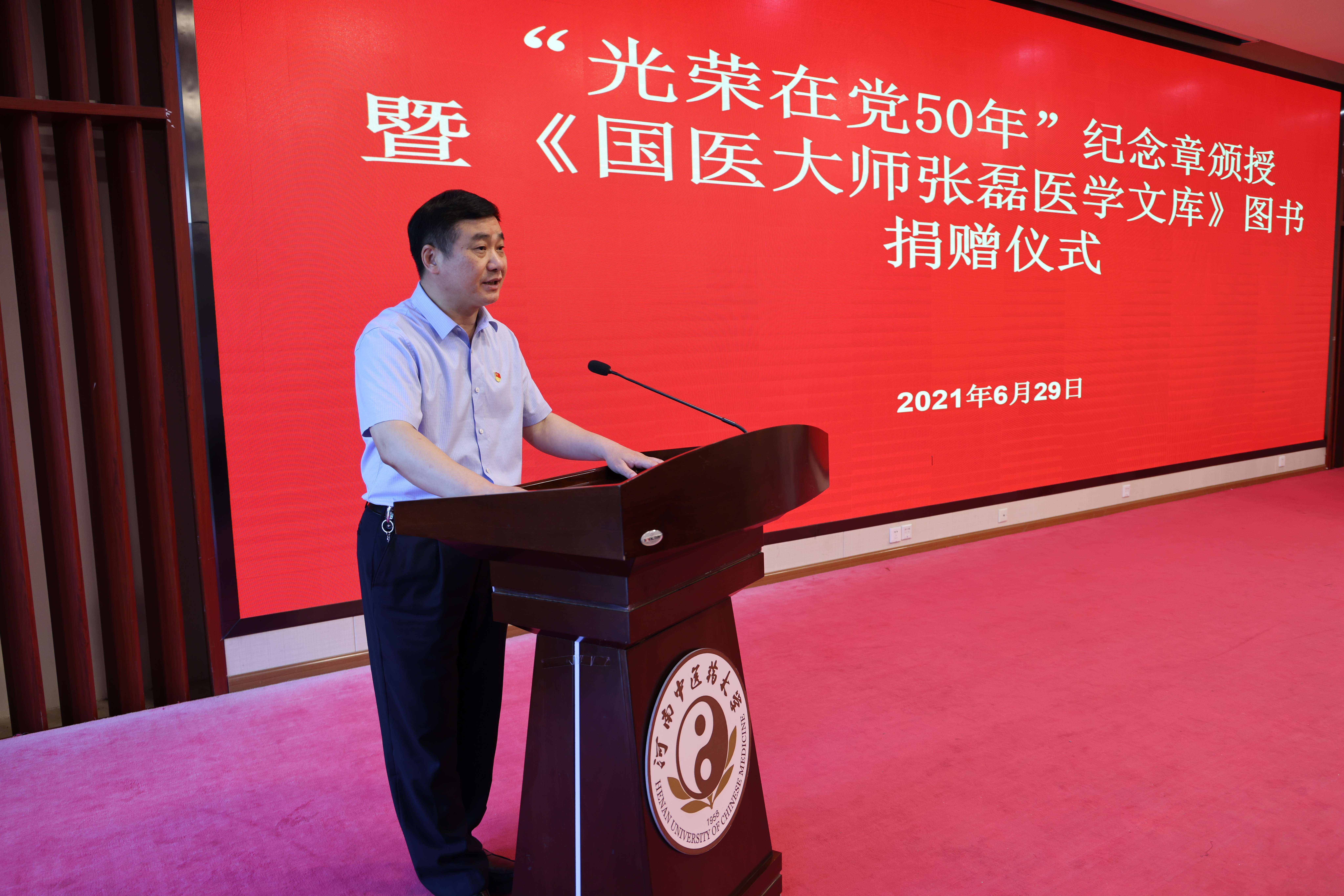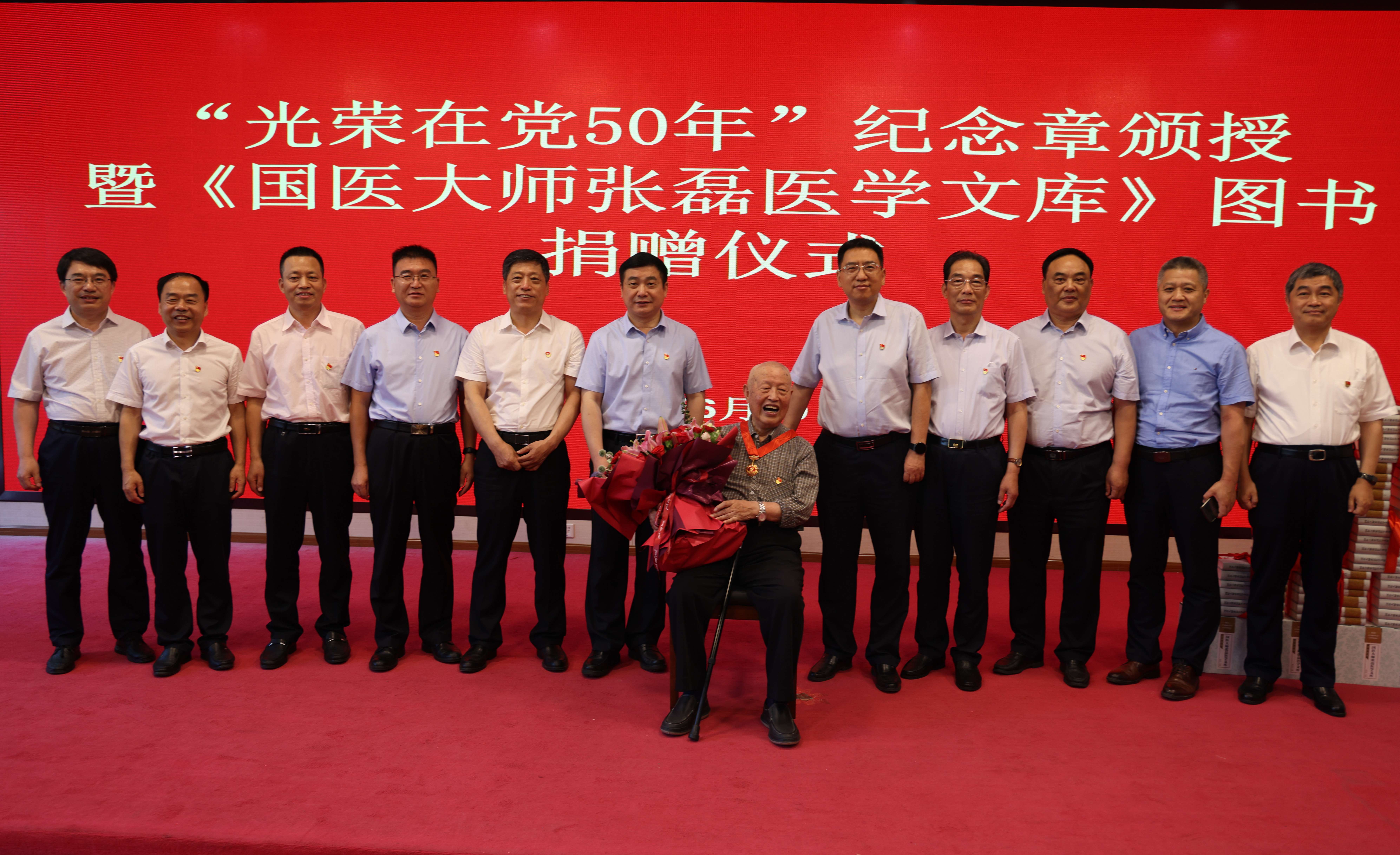 本网讯(通讯员孙璐 图田辉 潘向昆) 光荣在党五十载,初心如磐使命坚。为庆祝中国共产党成立100周年,落实习近平总书记在南阳考察调研时对中医药工作做出的新指示。6月29日下午,我院在河南中医药大学龙子湖校区举办“光荣在党50年”纪念章颁授暨《国医大师张磊医学文库》图书捐赠仪式。国医大师张磊,河南省卫生健康委党组书记、主任阚全程,河南省卫生健康委副主任、一级巡视员张智民,河南省卫生健康委办公室主任路修德,学校党委书记别荣海、校长许二平,党委副书记、工会主席张小平,山东科技出版社总编辑苑嗣文和学校图书馆、我院领导班子成员等出席仪式。仪式由我院党委书记周运峰主持。