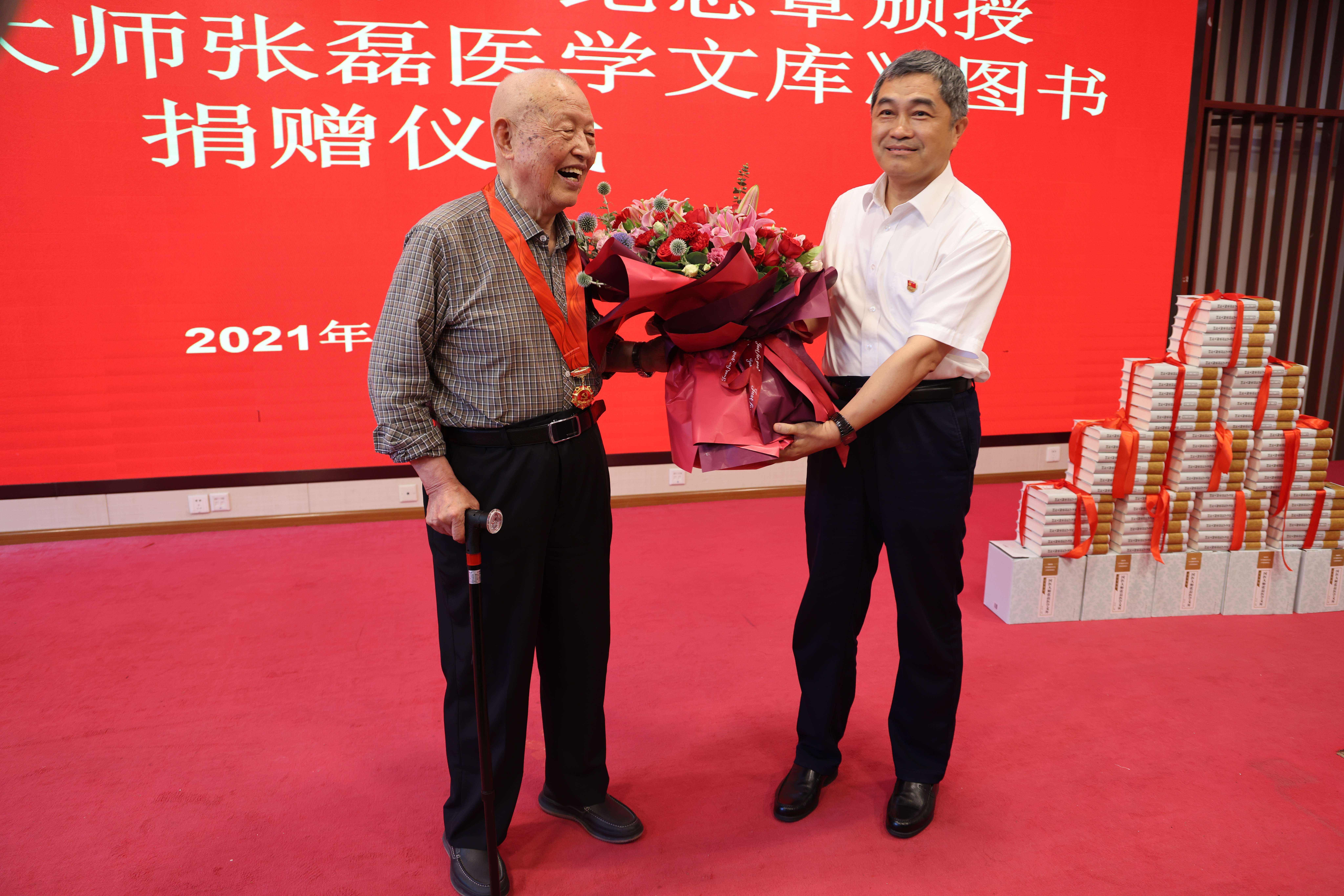 在图书捐赠仪式上,张磊老师向学校捐赠《国医大师张磊医学文库》图书,图书馆党总支书记何明举代表学校向张磊老师心系母校发展、倾情捐赠学术专著表示衷心的感谢和诚挚的敬意,并为张磊老师颁发了捐赠证书。