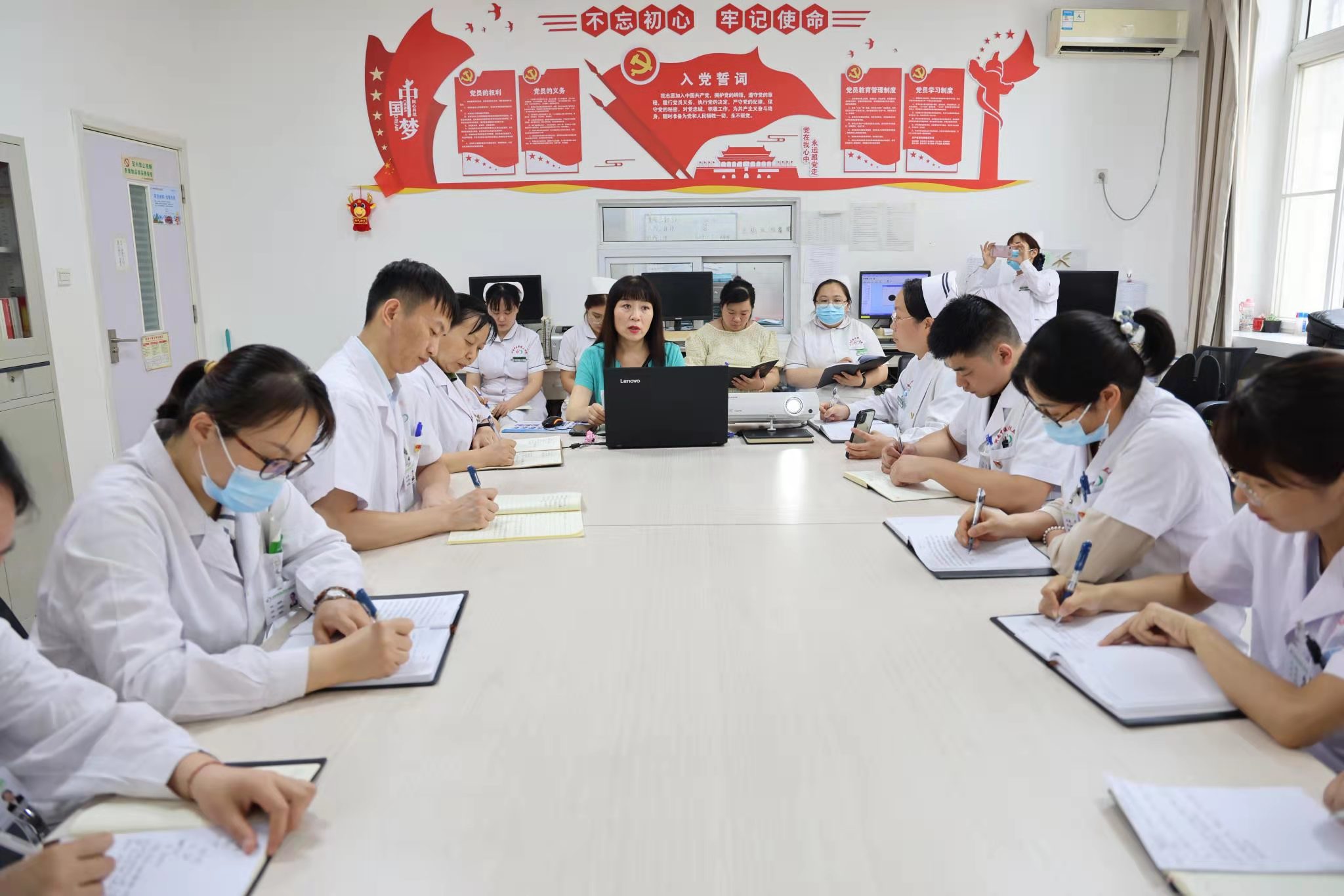 焦钧副书记希望大家以党章为根本,遵循并结合党史学习教育及医院实际发展情况提出了四方面的要求:第一,我们学习党章就要学习坚定的理想信念。坚定理想信念,是对一名共产党员的基本政治要求。党的事业,就是靠千千万万党员的忠诚奉献而不断铸就的。对于我们医院来讲,党员职工是医院党委各项决策部署的具体落实者,是医院事业发展的具体推动者。作为党员职工,一定要始终坚定理想信念,时刻以党员的标准严格要求自己,立足自身的岗位身先力行、率先垂范,在服务医院建设中奋勇争先。第二,我们学习党章就要学习为民服务宗旨。身为共产党员,我们要时刻不忘全心全意为人民服务的党员初心和救死扶伤的医者仁心。自觉维护群众健康权益,不断在为民服务中创先争优,持续转变工作作风,提升服务水平,切实方便患者群众就医,用实际行动践行自己的入党誓言。第三,我们学习党章就要学习甘于奉献的政治品格。在困难和危险面前,只有党员先上,才能组织、动员和凝聚起更多群众一起去拼搏奋进。我们对照党章规定,就要在工作和生活中切实发挥先锋模范作用,坚持让党的旗帜飘扬在医疗、教学、科研、管理等各个领域,以上率下带动群众积极投身医院的发展,以自己示范引领作用凝聚起推动医院发展的强大力量。第四,我们学习党章就要学习严明的政治纪律。学习党章,首要的是遵守维护党章,自觉严明政治纪律。要自觉维护中央权威,厉行工作规程,做到令行禁止,保证中央政令畅通。要严格执行党章关于党内政治生活的各项规定,敢于坚持原则,勇于开展批评和自我批评,带头弘扬正气、抵制歪风邪气。最后焦钧副书记要求大家以实际行动树立共产党员的良好形象,做到平常时间能看得出来,关键时刻能冲得出来,危难时刻能豁得出来。要把对《党章》的学习和实际工作结合起来,要从自身做起,从小事做起,从点点滴滴做起,更好的为人民做好医疗保障工作,为医院的发展做出新的贡献。