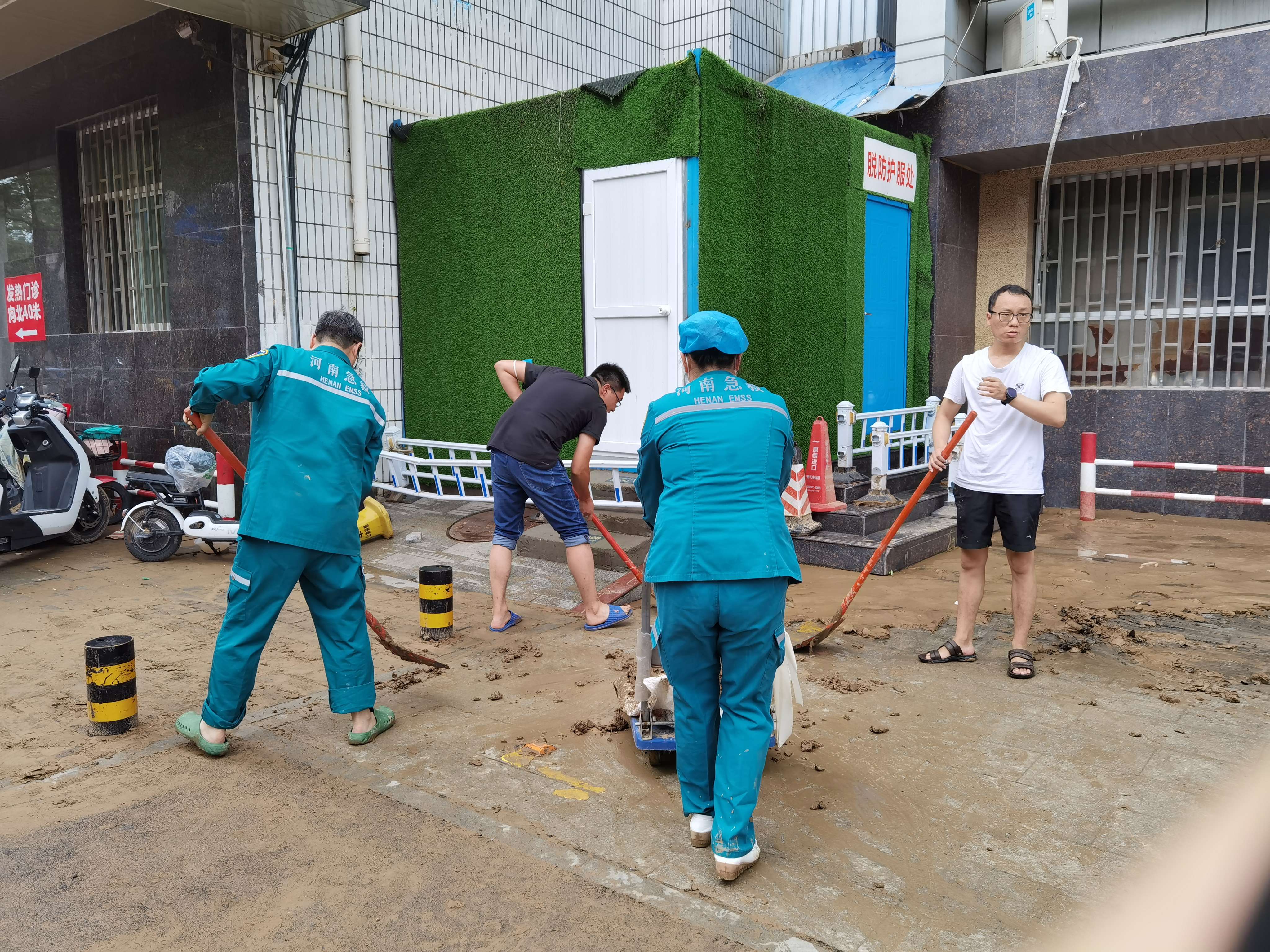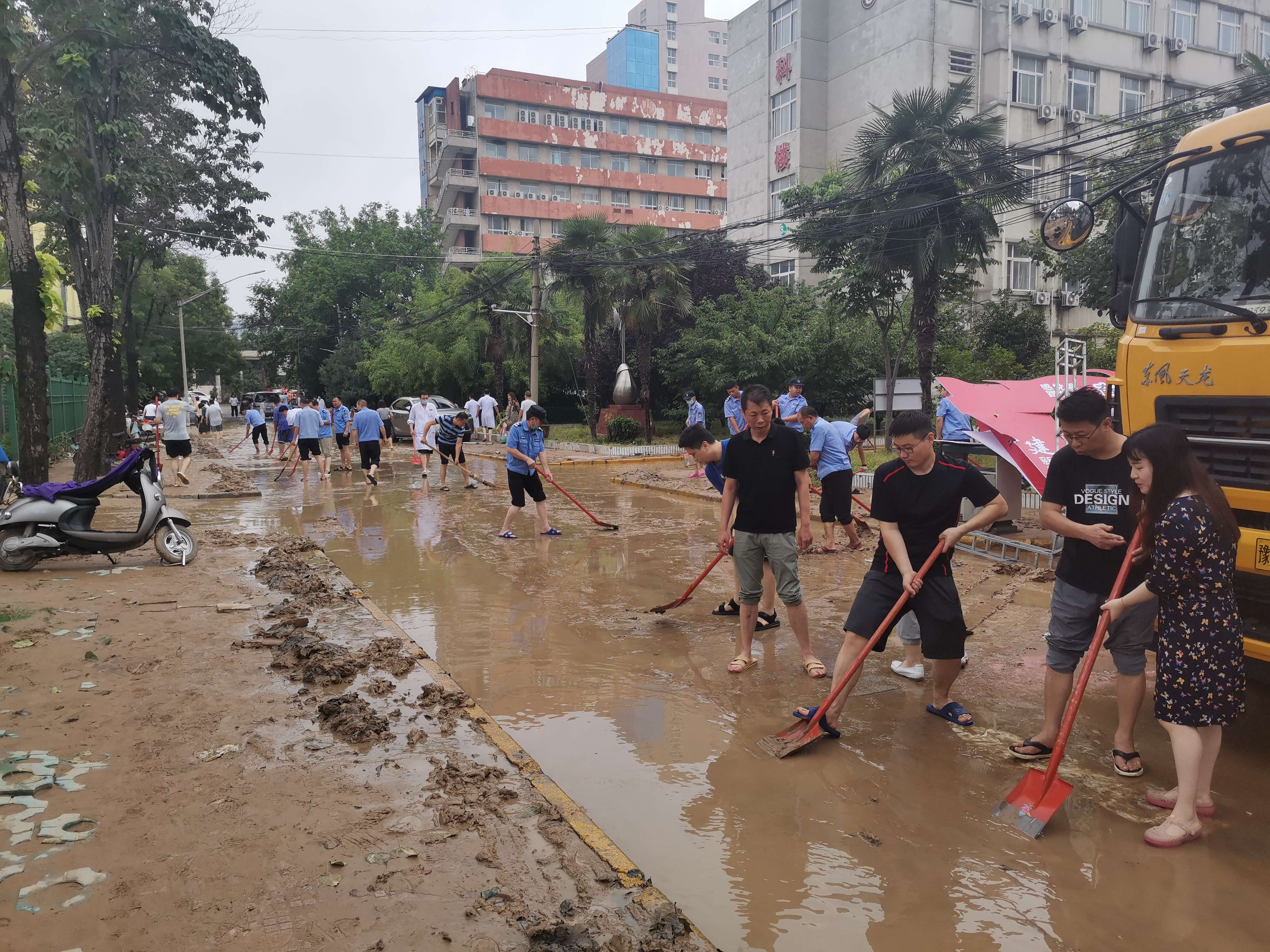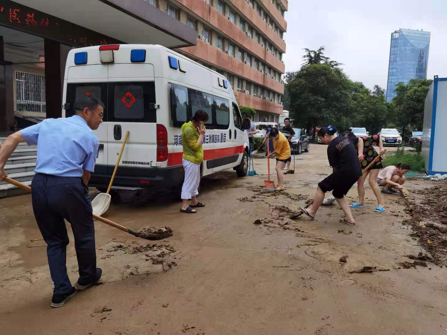 会议结束后,在1号楼前现场召开院区清淤清障动员会,领导班子成员带领各职能部门和后勤保卫等部门人员参加突击活动。周书记要求,按照会议要求,一是立即组织清淤清障突击队,开展自救工作。二是要充分发挥党员先锋模范作用作用,党员干部示范引领,发扬伟大抗疫精神和抗洪精神。三是要发扬三附院人越是困难越奋进的精神,确保今天清淤清障完成,道路通常!