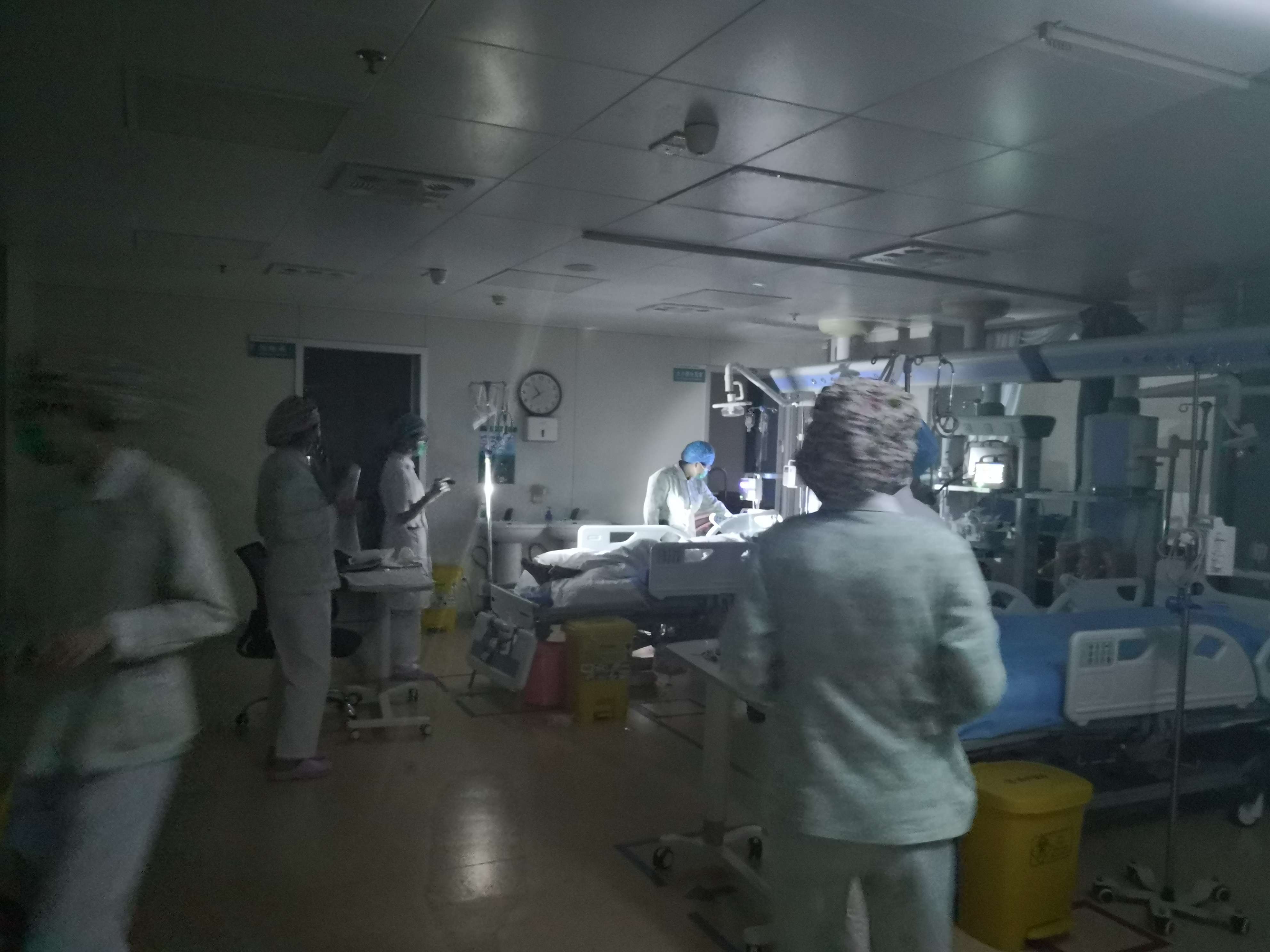 7月20日大灾来临后,洪水倒灌,阻断了一切出入医院的道路。ICU李玲玲护士长和张柳婧大夫带领科内13名护士(包括一名孕妇)和4名护理实习生坚守科内72小时,尽心尽力保障患者安全。科内当时有2名患者,其中一名患者昏迷,气管切开,无自主呼吸持续呼吸机应用,7月20日8:00发现科内负压病房漏水,各个房间窗户漏雨,护士长开始组织人员用水桶一边接水一边往外扫水,排查各个房间安全隐患,转移仪器设备及科内贵重物品,确保医院财产安全。并照顾危重患者,安慰清醒患者,与家属做好沟通工作。16:40停电,护士长开始指挥启用科内有备用电源的呼吸机及心电监护;科内4台呼吸机,每台呼吸机备用电平均1.5个小时,排队接力;搜罗所有手电筒,每人一个,联系各科室护士长,分派人员跑遍各楼层借有备用电的心电监护。联系周边所有医院熟人及120联系转运,21:45联系麻醉科杨军主任借麻醉机当呼吸机使用。23:00护士长借到一个小型电瓶,一边给患者使用,一边给其它呼吸机充电,凌晨3:20电瓶没电,转换充满电的呼吸机后立刻寻找电瓶充电线及联系充电,ICU保洁员胡瑞冒着生命危险跳到地下室,寻找充电线,当时水没过她的脖子,找到后准备返回,发现门被漂浮的沙发桌子挡住,在水里挣扎了半个多小时拼劲最后一点力气才爬上来,出来后整个人都快虚脱了,还不忘跑到7楼协助护士长给危重患者送电线。凌晨5:00最后一个呼吸机备用电也即将耗尽,护士长在所有微信群里发布寻求发电机支援的消息,5:20病理科孙春霞老师提供病理科UPS,联系到5名保安跑到15楼抬着几百斤重的电源下来又转送到外科楼7楼的ICU,6:00与总务科找到一台没有熄火的120车,扯电线到七楼,护士们跑遍整栋楼找了7个电插板将线连到患者床头,一边使用,一边给其它呼吸机充电。整夜张柳婧大夫和许蒙大夫都在跟两位患者家属沟通,安慰清醒患者,护士长在向上级汇报,并电话联系各个人员寻求帮助和联系电源,8:00大家几近虚脱,又分派3名护士值班看护患者,2名护士接着去借心电监护,3名护士去楼下提水,护士长和张柳婧大夫整理科内垃圾,打扫卫生,3名护士外出为患者及工作人员找水和食物。4名实习生和一名孕妇科内休息整顿,修整过后,为保证科内正常用水,一群瘦弱的姑娘们往返楼梯间二十余趟提到科内30多桶水供清洗消毒患者物品。大灾无情,人间有意,虽然我们几天坚守下来已经衣衫不整,油头垢面,筋疲力尽,腰疼到直不起来,但是一群年轻的医护人员只要能全力保障患者安全,再丑再苦再累都不怕,这就是我们最美的样子!