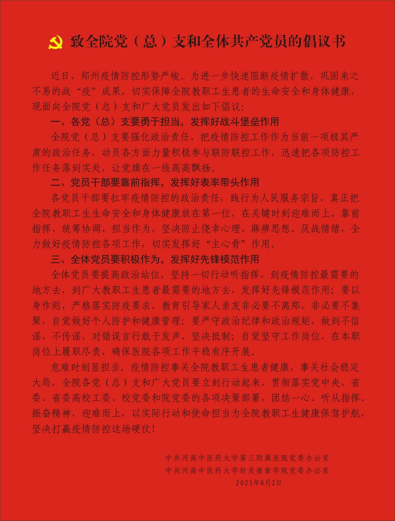 近日,郑州疫情防控形势严峻。为进一步快速阻断疫情扩散,巩固来之不易的战“疫”成果,切实保障全院教职工生患者的生命安全和身体健康,现面向全院党(总)支和广大党员发出如下倡议: