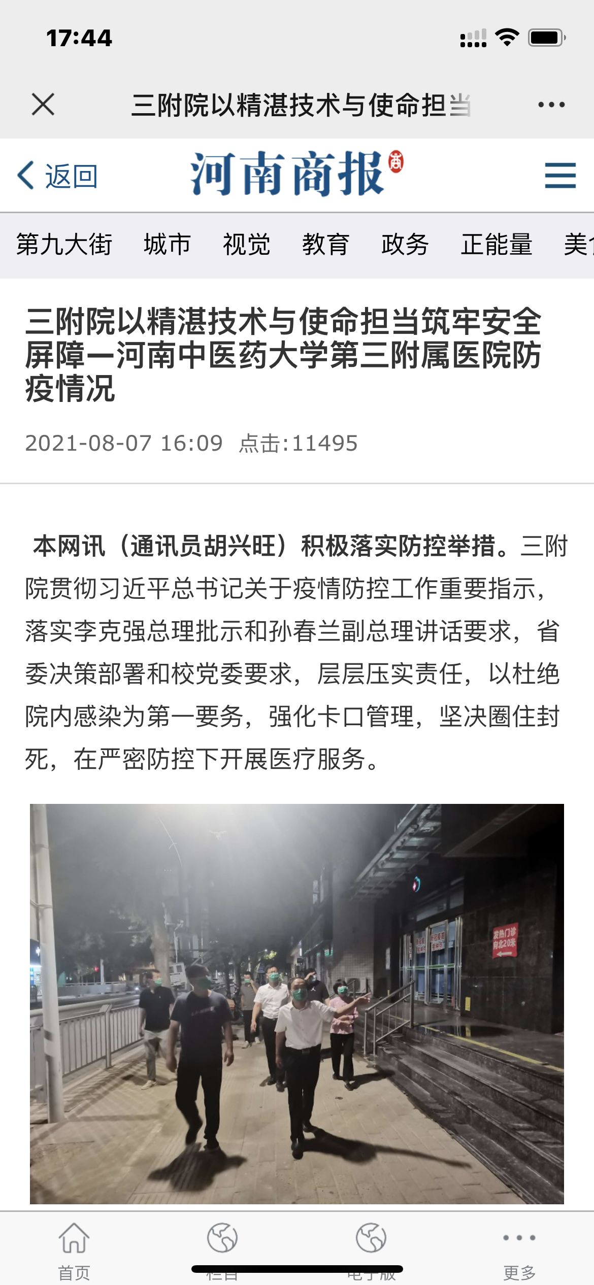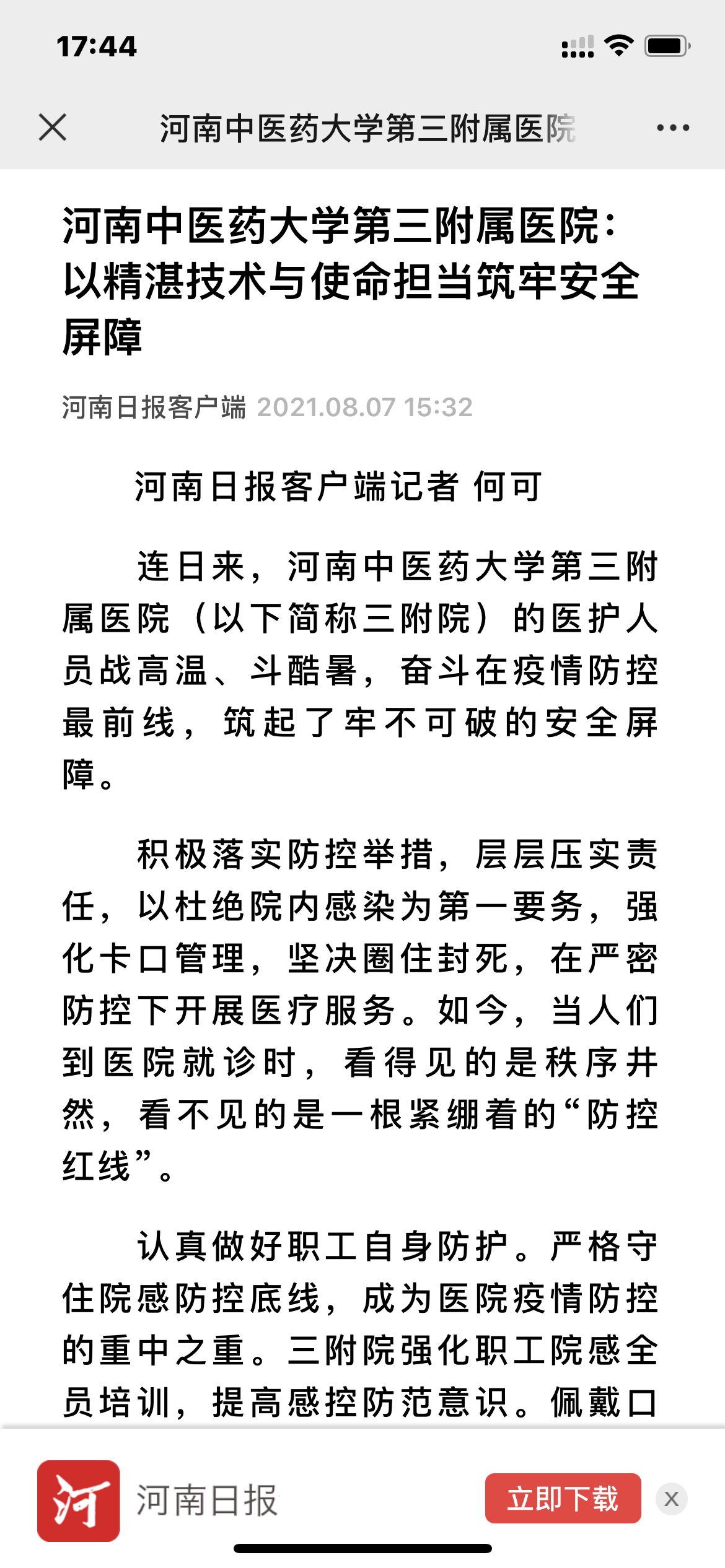 编者按:2021年8月7日, 河南日报客户端、河南商报、河南健康网等省内主流媒体报道我院以精湛技术与使命担当筑牢安全屏障。