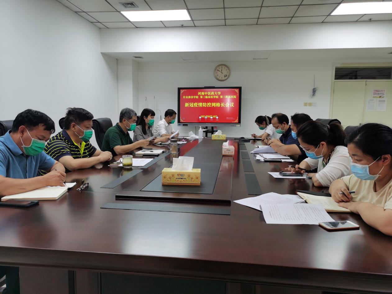 本网讯(通讯员李映月 吉云鹏 赵冰 图李映月) 为切实扛牢疫情防控政治责任,确保东明校区疫情防控各项工作真正落实落细,2021年8月10日上午,针灸推拿学院召开新冠肺炎疫情防控网格长会议,东明校区宿舍楼二级网格长、医院院长张大伟、三级网格长党委副书记焦钧、副院长高翔、四级网格长纪委书记刘会勋、工会主席蔡庆春和针灸推拿学院全体辅导员参加本次会议。会议由张大伟院长主持。