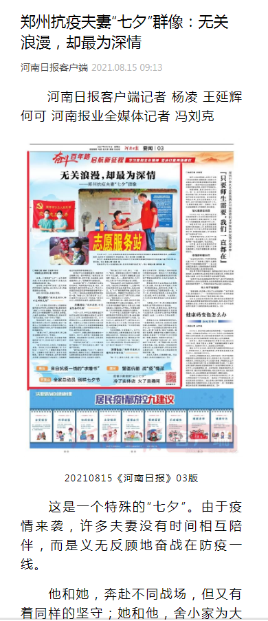 编者按:近日,河南日报客户端对我院护理部副主任王晓娜和手术室医生彭栋梁夫妇等的抗疫事迹进行报道。