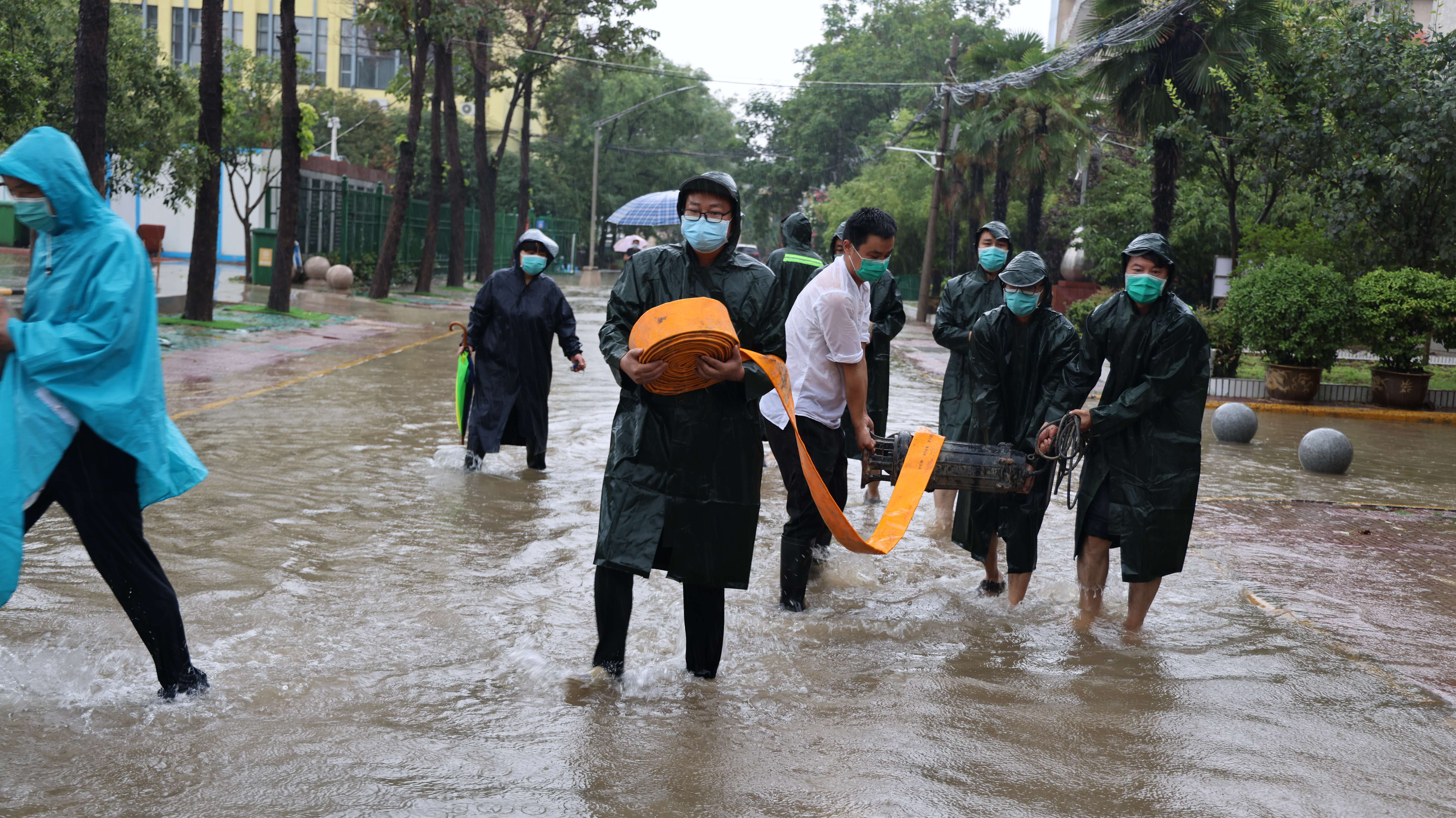 22日下午,暴雨骤降,周运峰、张大伟、张进一、王志超、蔡庆春等院领导身先士卒,靠前指挥防汛工作,与抗洪抢险突击队员及相关部门同志并肩作战,扛沙袋、接排水管,并紧急联系大功率抽水机等设备开展院区积水排涝工作,汗水和雨水交织如注,生动诠释了三附院人的众志成城与不屈担当。