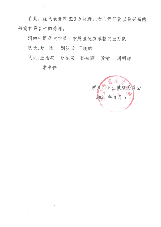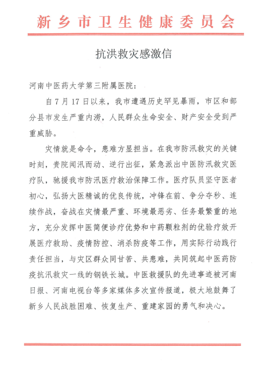 编者按:闻“汛”而动!白衣战士集结驰援新乡卫辉市!2021年7月28日中午,按照河南省卫健委的防汛救灾紧急通知,我院党委立即部署,迅速组建了一支由肺病科、肝胆脾胃科、疼痛科等专业3名医生、3名护士、2名转运员共8人组成的抗洪医疗队支援卫辉。医疗队在救灾前线时刻以群众健康需求为重,充分发挥中医优势,积极运用中医药和针灸推拿特色技术为安置点群众提供卫生应急保障,开展了耳穴贴压、铜砭刮痧、砭石灸、雷火灸、腕踝针等中医护理技术7项,共600余人次受益,为当地群众发放国医大师张磊的防疫处方“四豆饮”配方颗粒剂860剂,发放玉屏风散配方颗粒近300剂和霍香正气配方颗粒近2500剂,充分保障了人民群众的健康,受到安置点群众的热烈欢迎。经过7天7夜连续奋战,医疗队圆满完成了各项工作抗洪救灾任务,受到新乡市卫健委表扬。