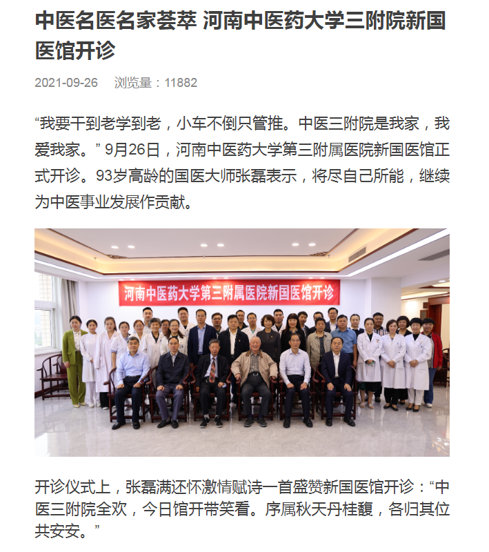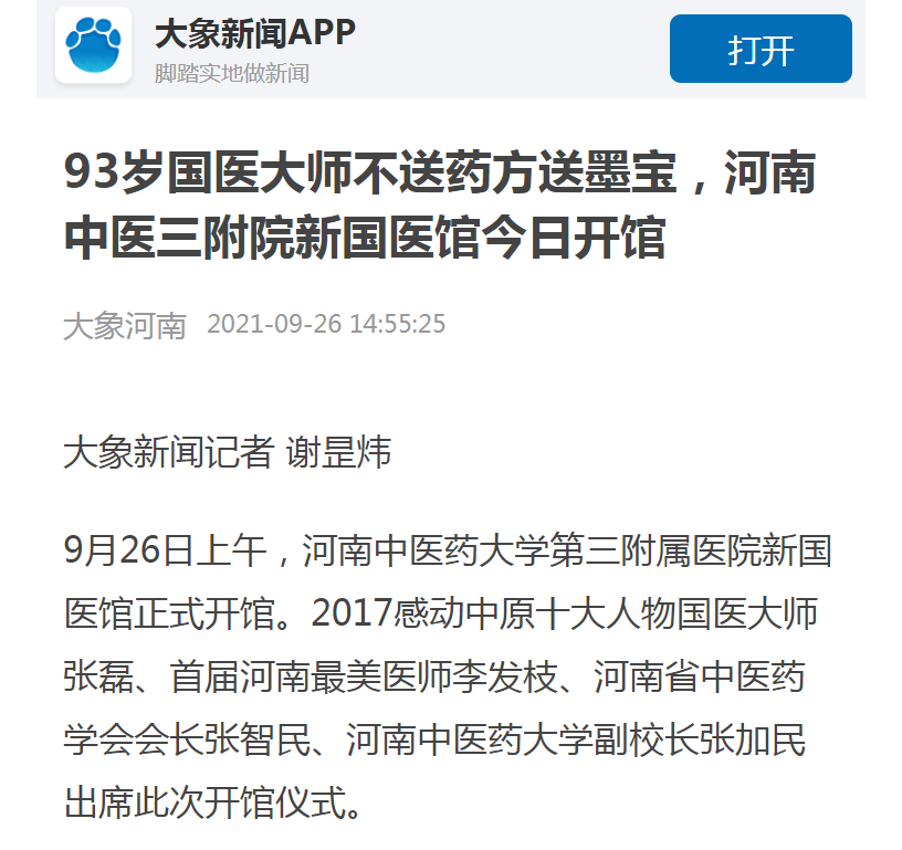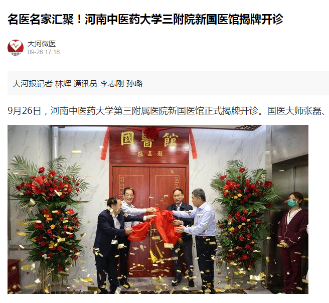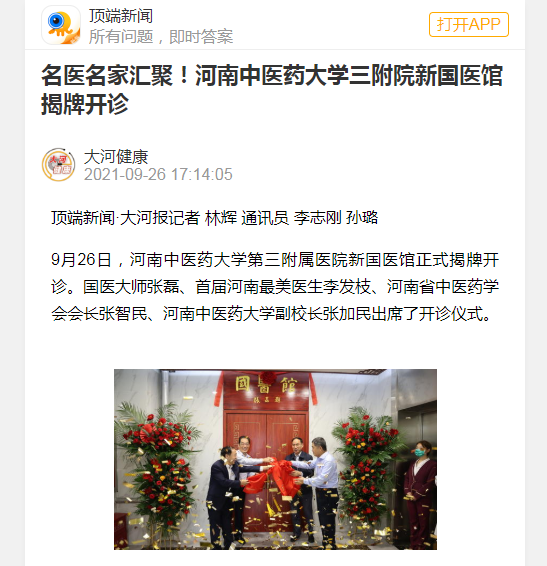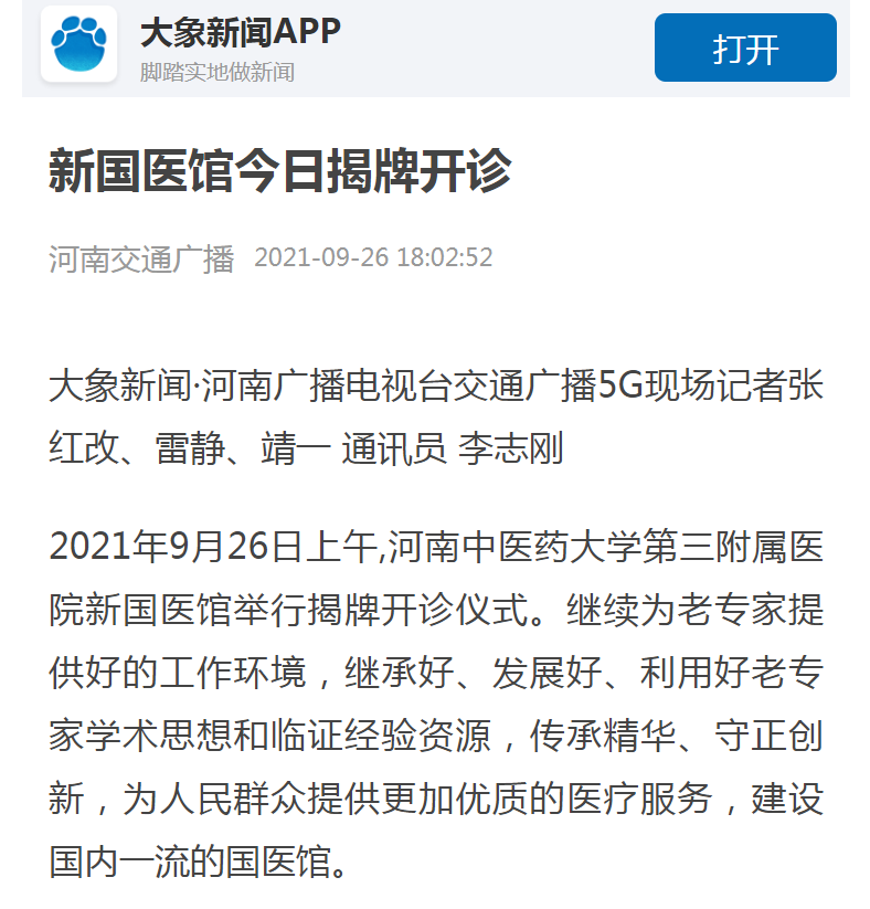 编者按:2021年9月26日,河南日报客户端、顶端新闻、河南交通广播、郑州日报、大象新闻、河南健康网等多家媒体对我院新国医馆揭牌开诊进行报道。