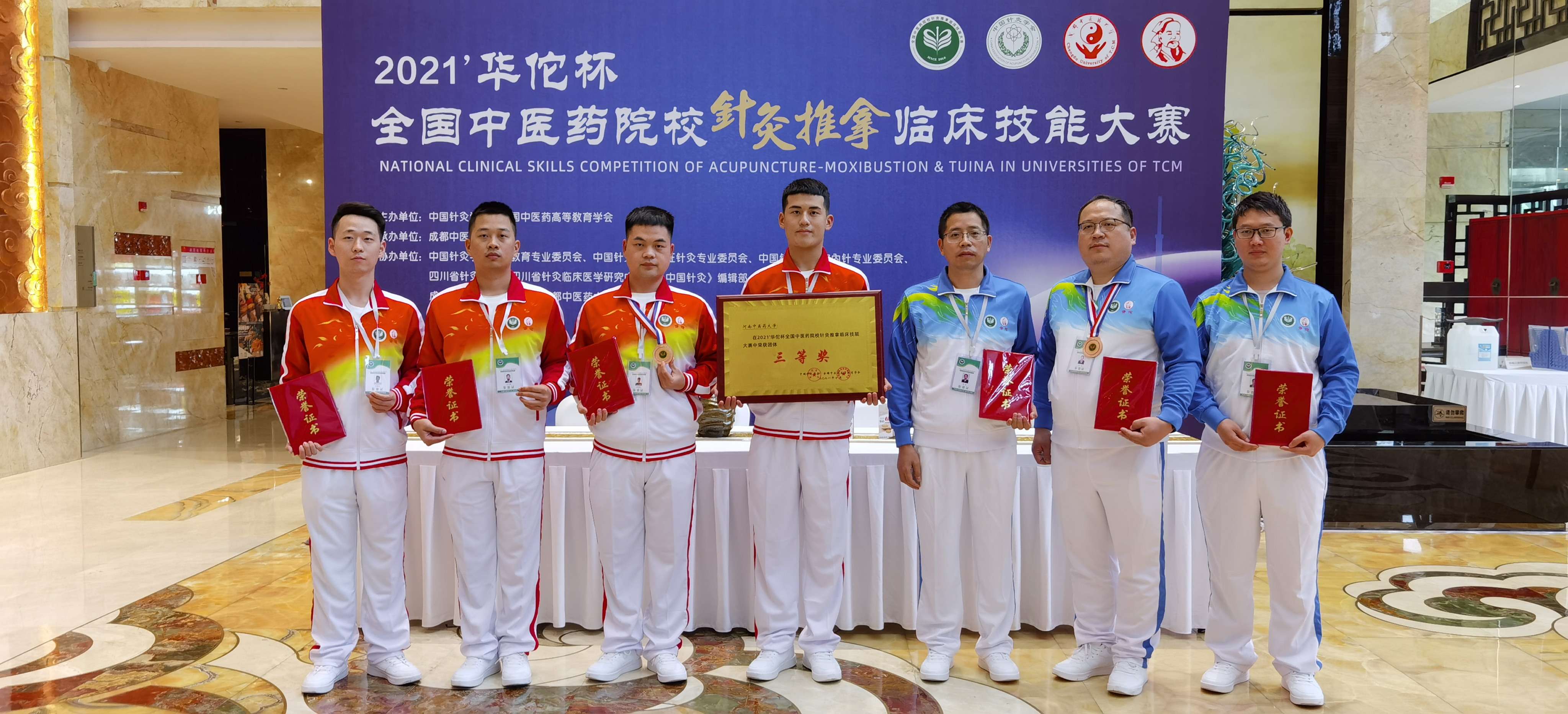 本网讯(通讯员任珊) 2021年10月16日-17日,由中国针灸学会、全国中医药高等教育学会联合主办,成都中医药大学承办的“2021全国中医药院校针灸推拿临床技能大赛”在四川省成都市举行。本届比赛共有33所高等院校参赛,我院3名教师代表、4名学生代表参加了比赛。经过激烈角逐,临床教师组董升获单项三等奖,周斌、李伟彪获个人优秀奖;学生组郭浩铭获单项三等奖,刘文鑫、樊紫阳、刘高飞获个人优秀奖;赵欣纪、陈新旺获优秀指导老师奖;我校代表团荣获团体三等奖、优秀组织奖。