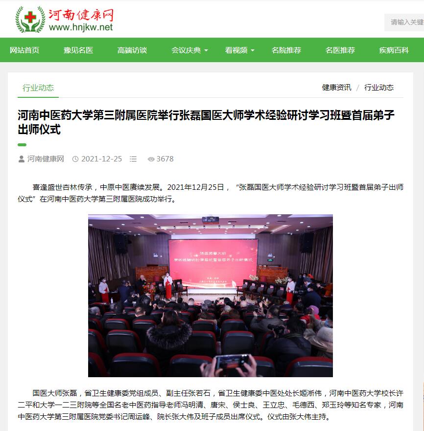 编者按:2021年12月25日,河南卫视、河南日报客户端、河南新闻广播、医药卫生报、郑州日报、大河健康报等多家媒体对我院举行“张磊国医大师学术经验研讨学习班暨首届弟子出师仪式”进行报道。