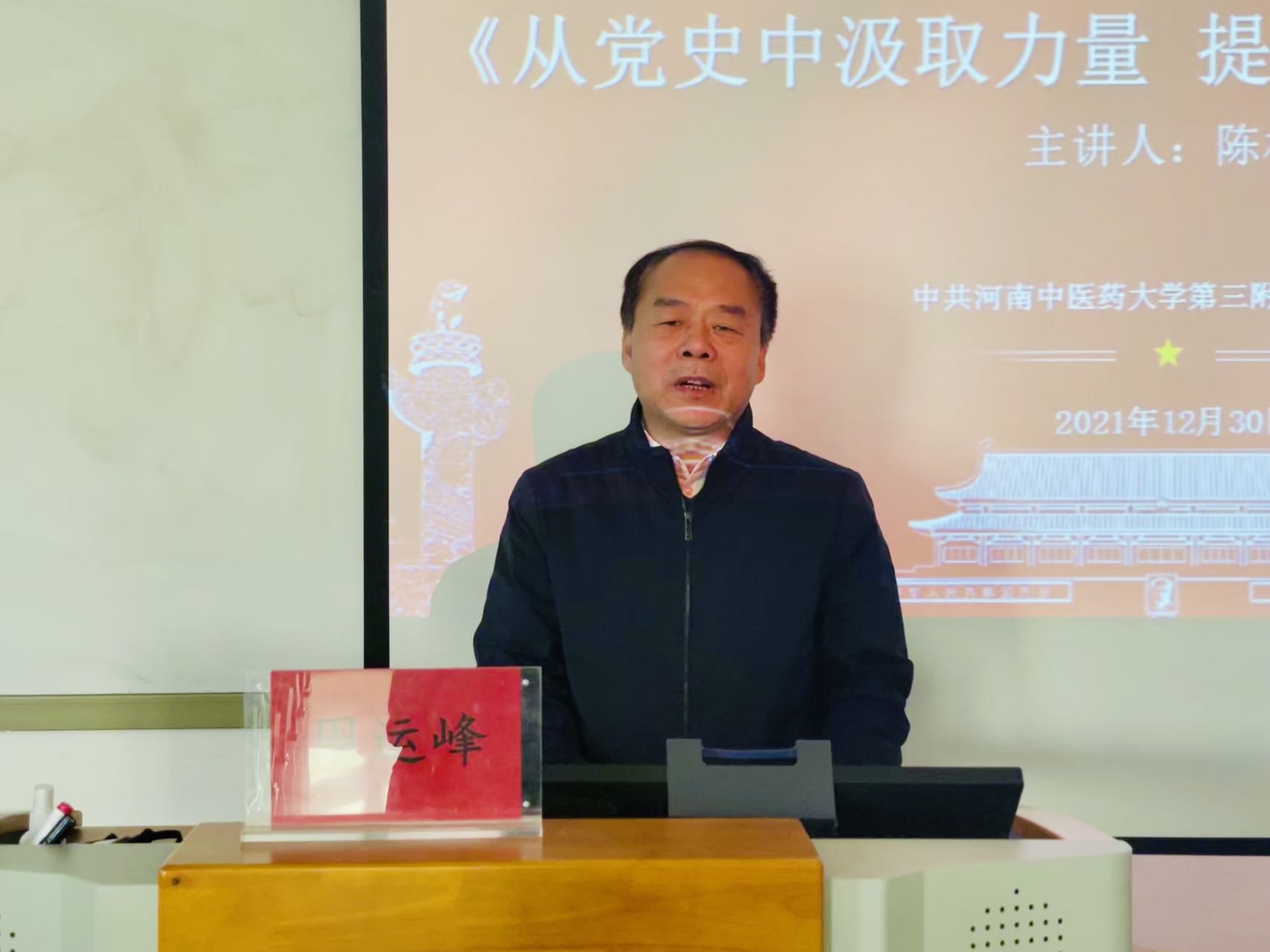 本网讯(通讯员徐展) 按照学校党委组织部《关于举办基层党组织书记培训班的通知》(河中医组函〔2021〕83号)和《河南中医药大学第三附属医院关于举办基层党组织书记培训班的通知》要求,2021年12月30日,我院在综合楼605教室开展了2021年度基层党组织书记培训班第四次培训。此次培训采取线上线下相结合模式,特邀河南中医药大学校长办公室主任陈相新授课。全院党(总)支部书记、党(总)支部委员、中层干部正副职和通讯员260人参加了培训。党委书记周运峰主持会议。