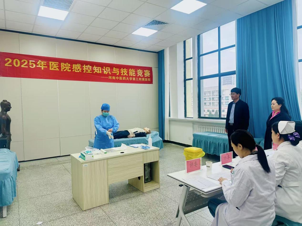2025年10月17日下午,我院2025年度感控知识与技能竞赛在教学实训中心举行。本次竞赛由医院工会办公室、感染管理科联合举行,以“穿脱一次性隔离衣”技能操作为核心内容,全面考核参赛选手在接诊疑似多重耐药菌(MDRO)患者过程中的感染防控能力。副院长胡斌现场观摩指导。