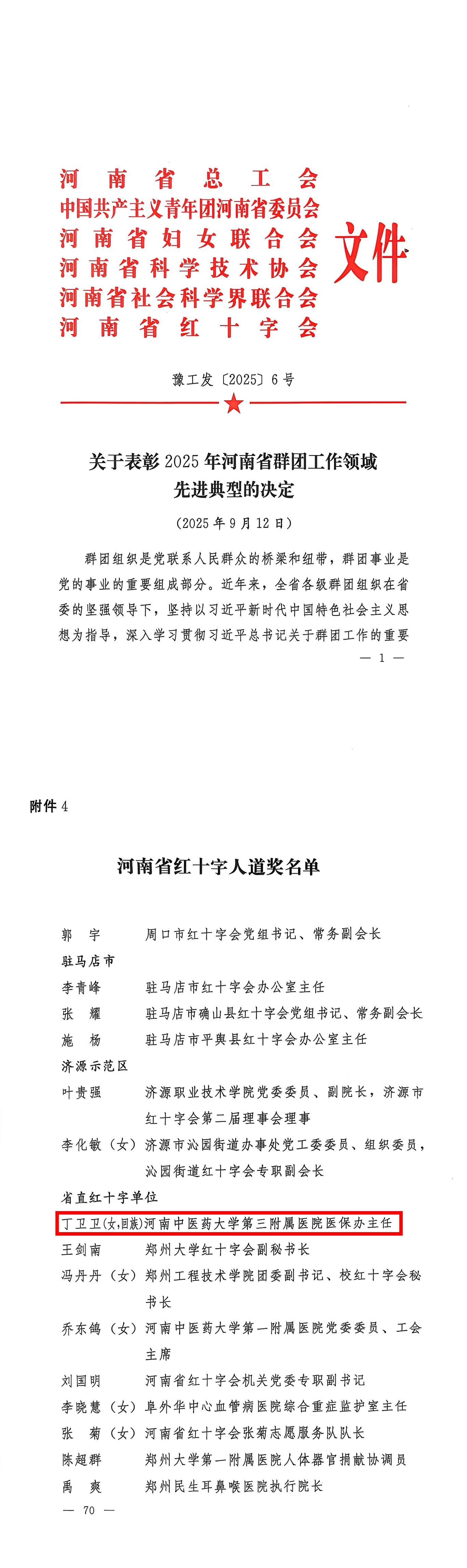 本网讯(通讯员王倩)近日,河南省总工会、中国共产主义青年团河南省委员会、河南省妇女联合会、河南省科学技术协会、河南省社会科学界联合会、河南省红十字会联合印发《关于表彰2025年河南省群团工作领域先进典型的决定》,我院医疗保险办公室主任丁卫卫同志荣获2025年度“河南省红十字人道奖”。这一殊荣不仅是对丁卫卫同志个人工作的充分肯定,更是对我院长期以来积极参与红十字事业、践行社会责任的高度认可。