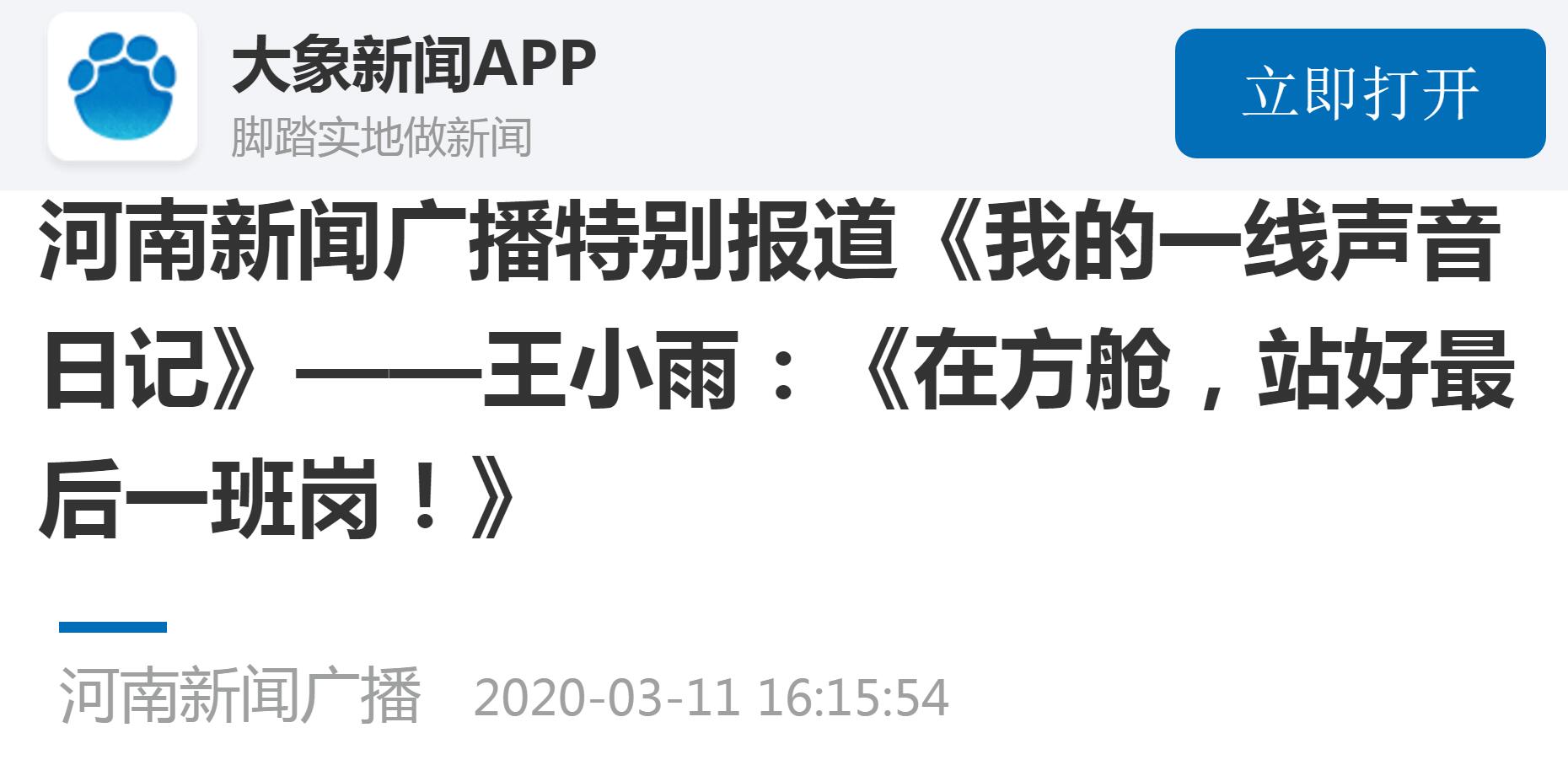 联防联控河南在行动,抗击疫情我们在一起。面对新冠肺炎疫情,有这样一群和死神赛跑的人,他们是父母,是妻子,是丈夫,是儿女……但在疫情面前,他们是身着白衣战袍的“天使”。河南新闻广播特别报道《我的一线声音日记》,来听国家(河南)中医医疗队队员王小雨的工作随笔:《在方舱,站好最后一班岗!》