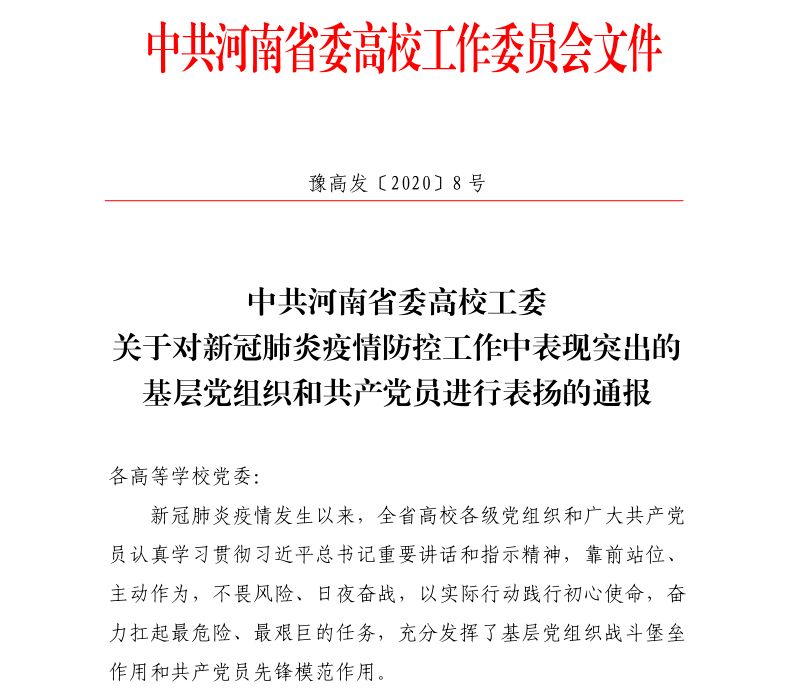 3月5日,省委高校工委印发《关于对新冠肺炎疫情防控工作中表现突出的基层党组织和共产党员进行表扬的通报》(以下简称《通报》),对在疫情防控工作中表现突出的18个基层党组织和31名共产党员进行通报表扬。