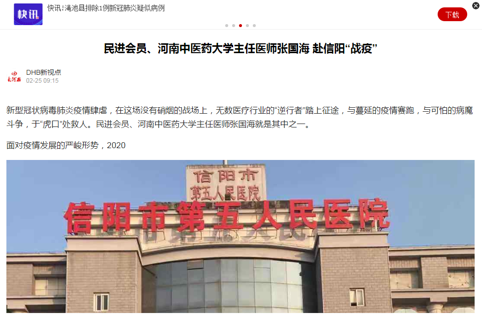 编者按:2020年2月25日,大河客户端对民进会员、我校主任医师张国海赴信阳“战疫”进行报道。现将全文刊发如下: