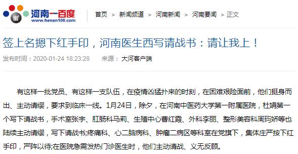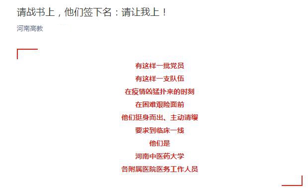 编者按:近日,今日头条、河南高教官微、河南一百度对我校附属医院院医务工作人员主动请战新型冠状病毒感染的肺炎疫情一线进行报道。现将今日头条全文刊发如下:
