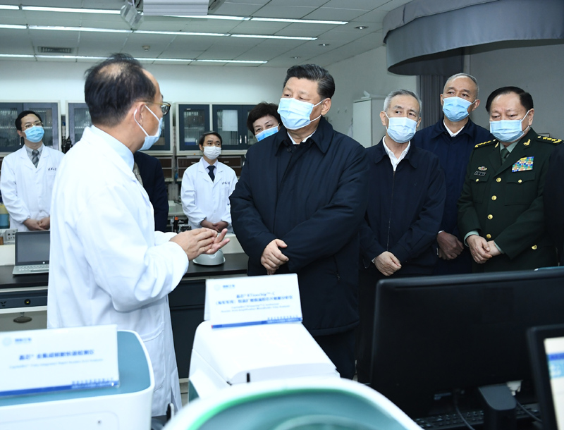 2日下午,习近平首先来到军事医学研究院,听取研究院关于新冠肺炎疫情防控科研攻关的总体情况汇报,结合展板和实物了解疫苗和抗体研制、药物筛选、病毒致病机理研究、快速检测试剂研究和应用等进展情况。在仪器测试楼,习近平察看了重大疫情应急防控药物研究室,向坚守岗位、奋力攻关的一线专家和科研人员表示亲切慰问。他强调,提高治愈率、降低病亡率,最终战胜疫情,关键要靠科技。习近平指出,新冠肺炎疫情发生以来,军事医学研究院坚决贯彻党中央和中央军委决策指示,闻令即动、争分夺秒,集中力量展开应急科研攻关,取得了阶段性成果,充分展现了人民军队忠于党、忠于人民的政治本色和敢打硬仗、善打胜仗的优良作风。习近平希望他们再接再厉,充分发挥突击队和主力军作用,尽快研制出安全有效的疫苗、药物、检测试剂,全力满足抗击疫情需要。要坚持在疫情可溯、可诊、可防、可治、可控方面合力攻关,通过打这场硬仗,掌握更多具有自主知识产权的核心科技,拿出更多硬核产品,为维护人民生命安全和身体健康、维护国家战略安全作出更大贡献。