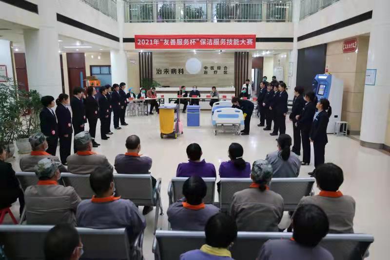 本网讯(通讯员万昀 潘向昆) 为进一步提升医院服务质量和服务水平,树立医院良好形象,全面提升保洁队伍操作技能,规范保洁服务行为,2021年11月19日下午,后勤科在治未病中心大厅举办了2021年“友善服务杯”保洁技能大赛。院党委书记周运峰、副院长张进一、纪委书记刘会勋出席大赛。院纠风办、感染管理科、护理部、工会、精神文明办等相关科室负责人作为评委参会。
