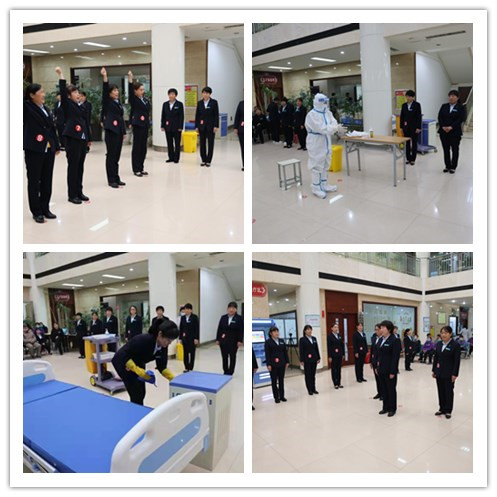 本次比赛经过初赛,最终由16名保洁员进入决赛。决赛内容包括形象展示、现场问答和实际操作三个部分。在形象展示部分,参赛保洁员依次进行七步洗手法团体演示、自我介绍、背唱医院院训、院歌和《优质服务理念二十条》部分相关内容,展示团队服务口号。在第二阶段参赛选手将对新冠防护知识、感染知识、保洁基础工作相关知识进行现场回答。随后的实际操作分为两个阶段:一为是保洁工作实操演练-床单元终末消毒,二为疫情防控实操演练-穿脱防护服。参赛队员在比赛中既注重团队合作,又各显其能、勇于争先,整个比赛呈现出一派紧张而热烈的竞赛场景。评委老师们也严格按照评分标准对参赛选手进行认真评判。