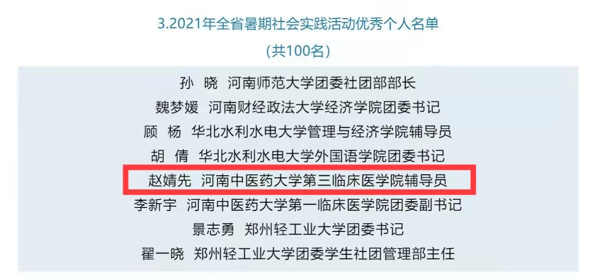 本网讯(通讯员赵婧先 图葛昕) 近日,河南省暑期社会实践活动省级优秀工作典型结果公布,第三临床医学院辅导员赵婧先获得“河南省暑期社会实践活动优秀个人”荣誉称号;第三临床医学院赴新县医疗服务团入围“投身乡村振兴,助力健康中国”全国大学生暑期社会实践专项活动;第三临床医学院《学习党史办实事、传承精神守初心》“三下乡”社会实践团队入围“第七届寻找全国大学生百强暑假实践团队”活动。