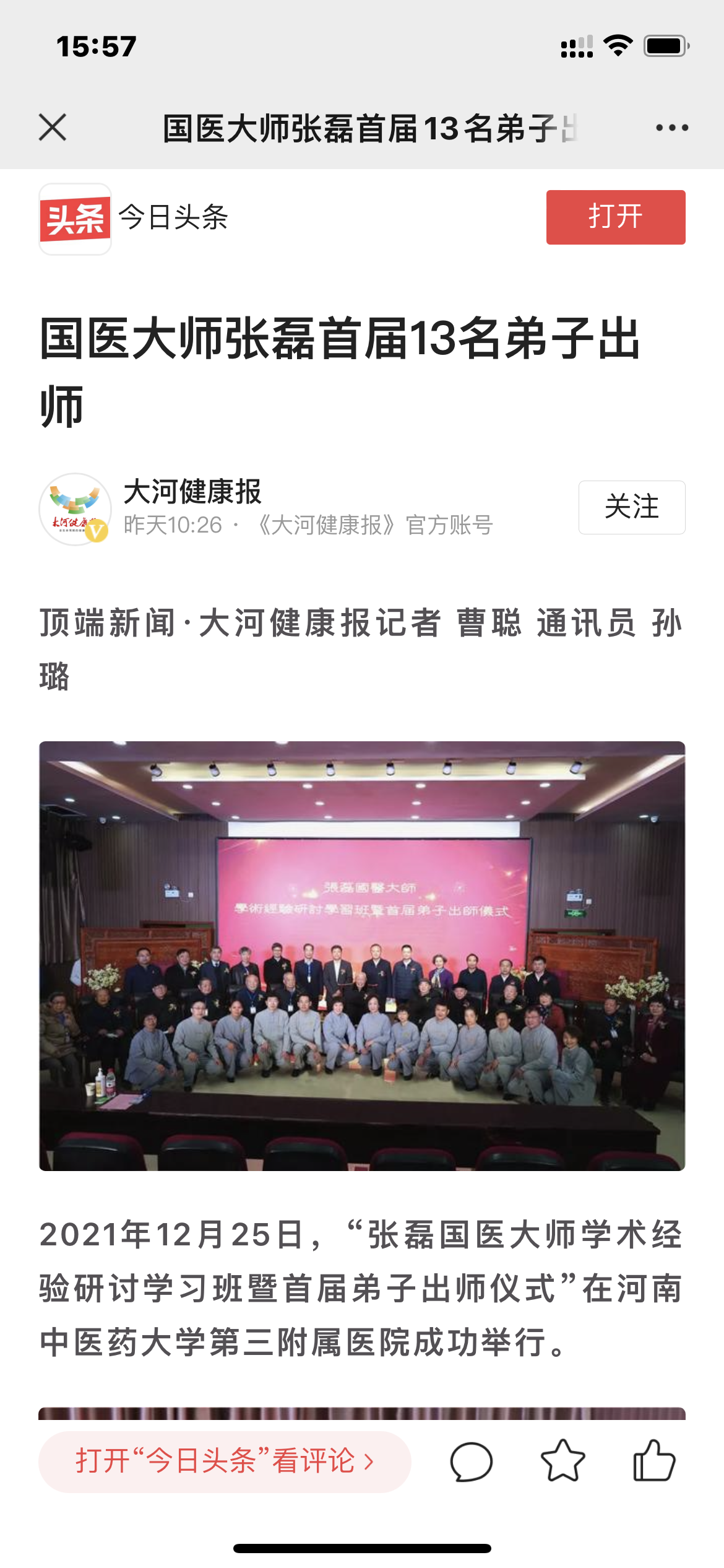 编者按:2021年12月25日,河南卫视、河南日报客户端、河南新闻广播、医药卫生报、郑州日报、大河健康报等多家媒体对我院举行“张磊国医大师学术经验研讨学习班暨首届弟子出师仪式”进行报道。