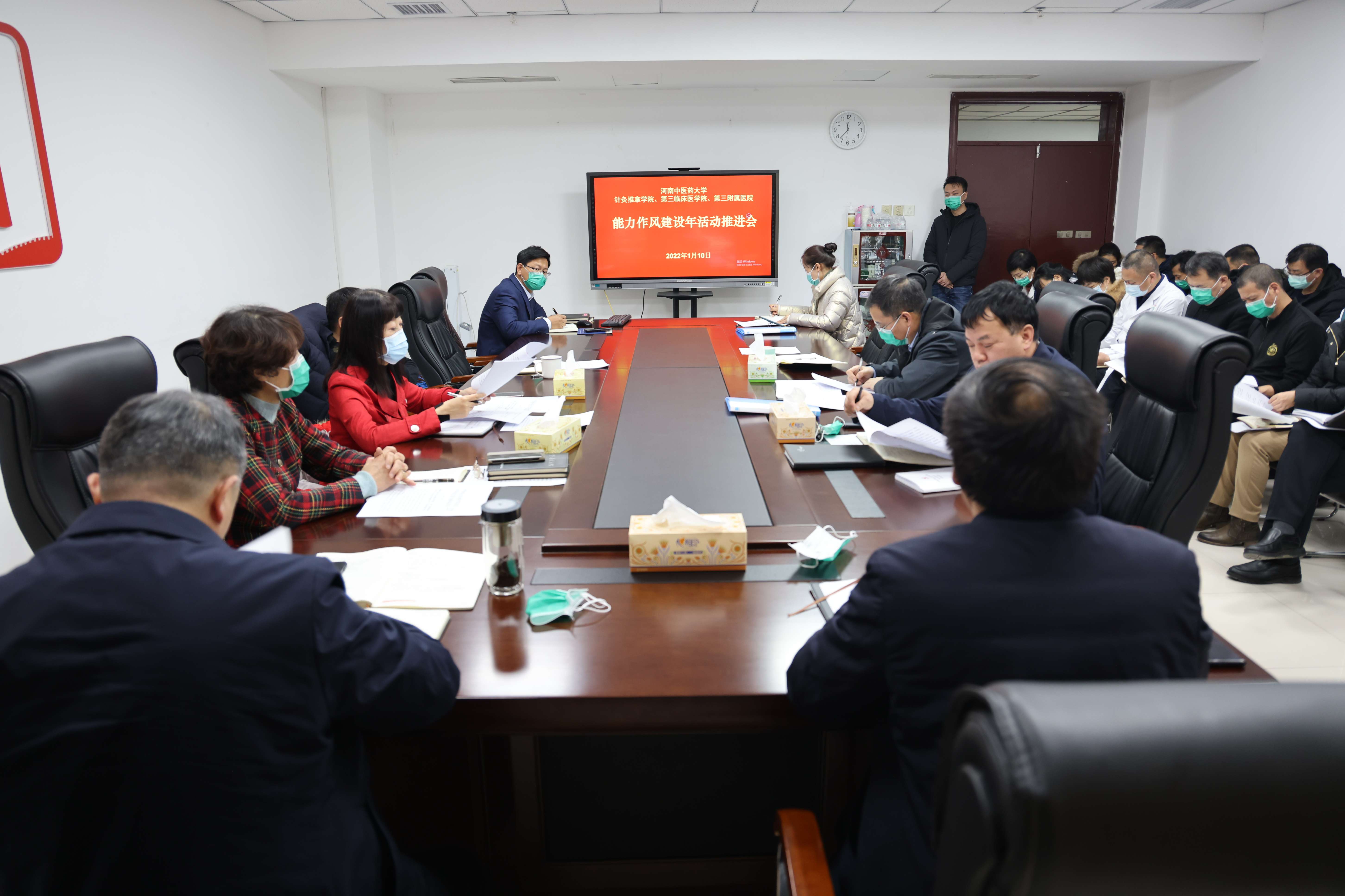 本网讯(通讯员郑楠楠) 自校党委启动“能力作风建设年”活动后,三附院党委迅速贯彻落实,召开动员会,研究制定实施方案。为深入贯彻省委、教育厅和校党委关于“能力作风建设年”部署安排,进一步统一思想,细化举措,抓细抓实“能力作风建设年”活动,2022年1月10日上午,三附院在综合楼1106会议室召开“能力作风建设年”活动推进会。医院在郑领导班子成员、党总支书记及相关科室负责人参加会议。
