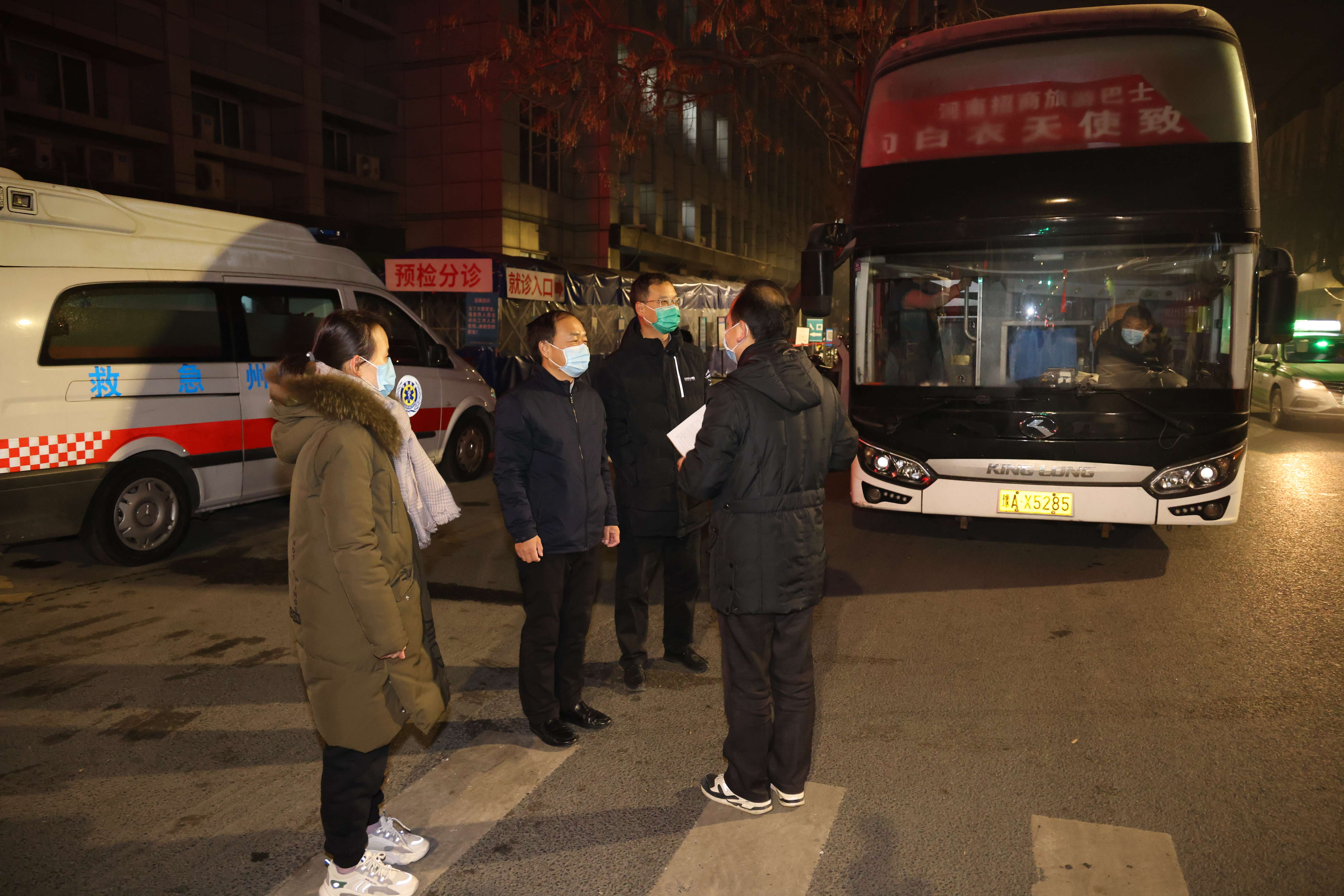 本网讯(通讯员潘向昆 图田辉) 2022年1月11日凌晨6:00,我院150人核酸检采集队员星夜又出征,党委书记周运峰,党委委员、副院长高翔,党委委员、工会主席蔡庆春和职能部门同志欢送队员。
