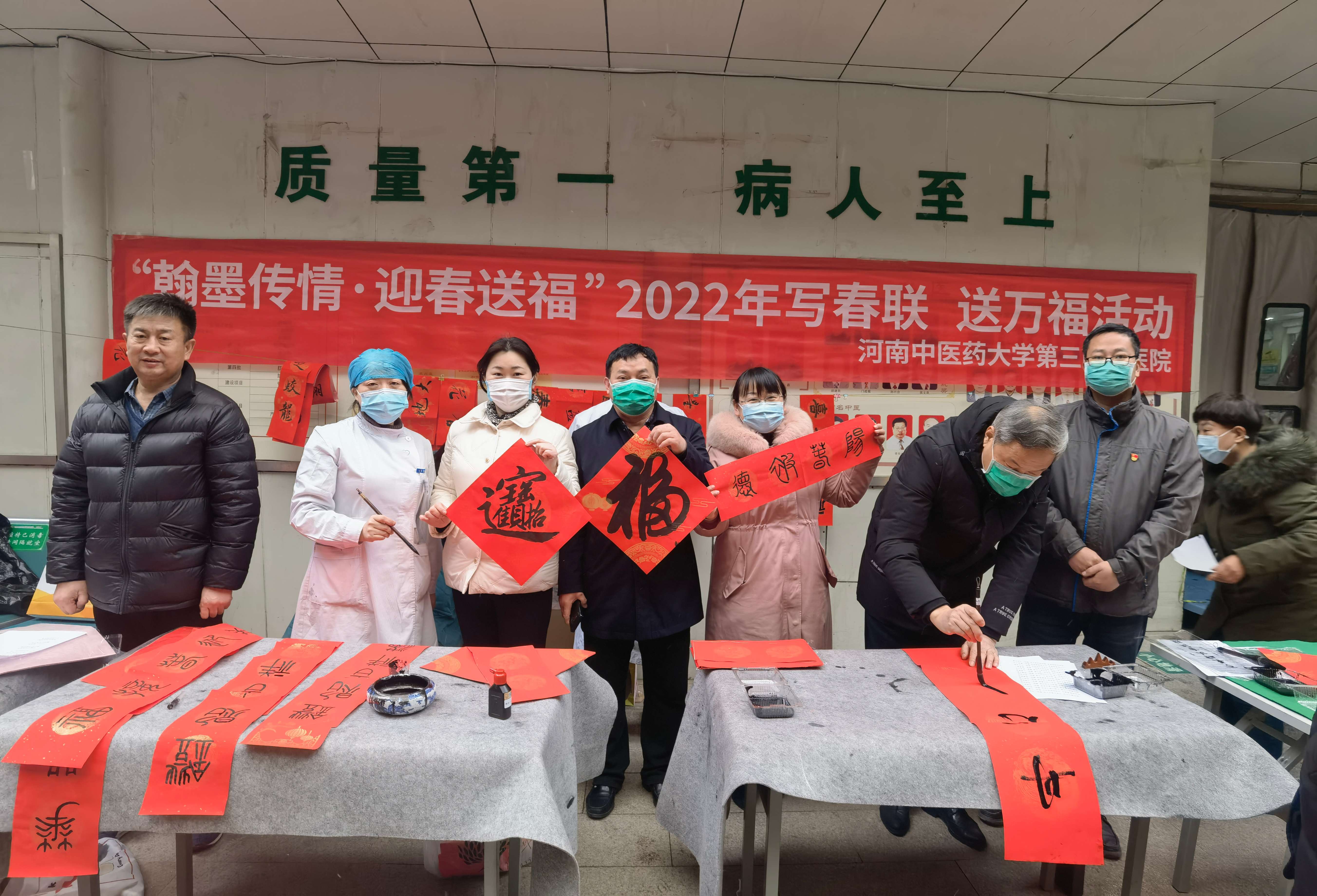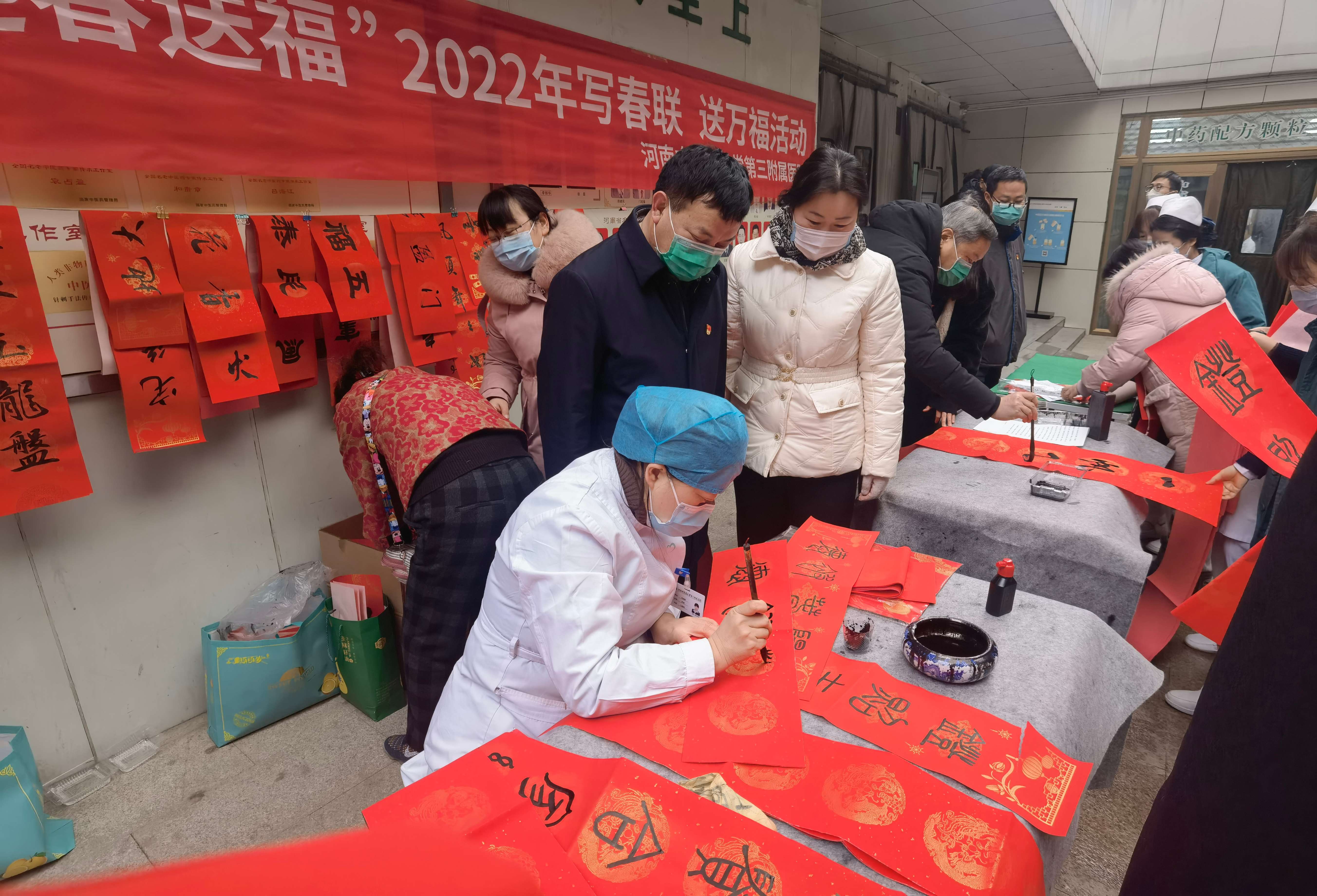本网讯(通讯员姜楠 图郭伟)冬已尽,春将至。在虎年新春佳节即将到来之际,为营造欢乐、祥和的节日氛围,驱散疫情阴霾,丰富广大职工群众业余文化生活,院工会邀请我院书法爱好者举办“翰墨传情·迎春送福”写春联、送万福活动,现场书写春联,为教职工和来院就诊患者送上新春祝福,党委委员、工会主席蔡庆春出席活动。