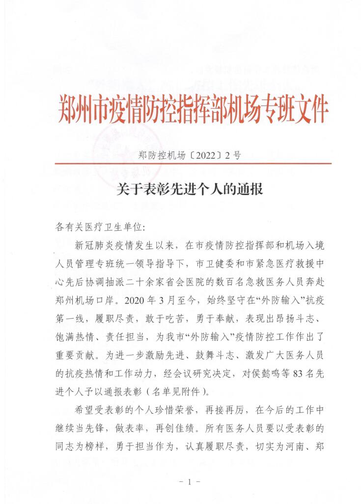 本网讯(通讯员潘向昆)近日,郑州市疫情防控指挥部机场专班下发《关于表彰先进个人的通报》(郑防控机场〔2022〕2号),表彰了一批在抗击新冠肺炎疫情斗争中涌现出的先进个人和先进集体。我院急诊科翟蒙蒙、张勤政获郑州市“外防输人”疫情防控工作先进个人荣誉称号,丁忠康、李帅杰、程辉、耍晨新等同志受到表扬。