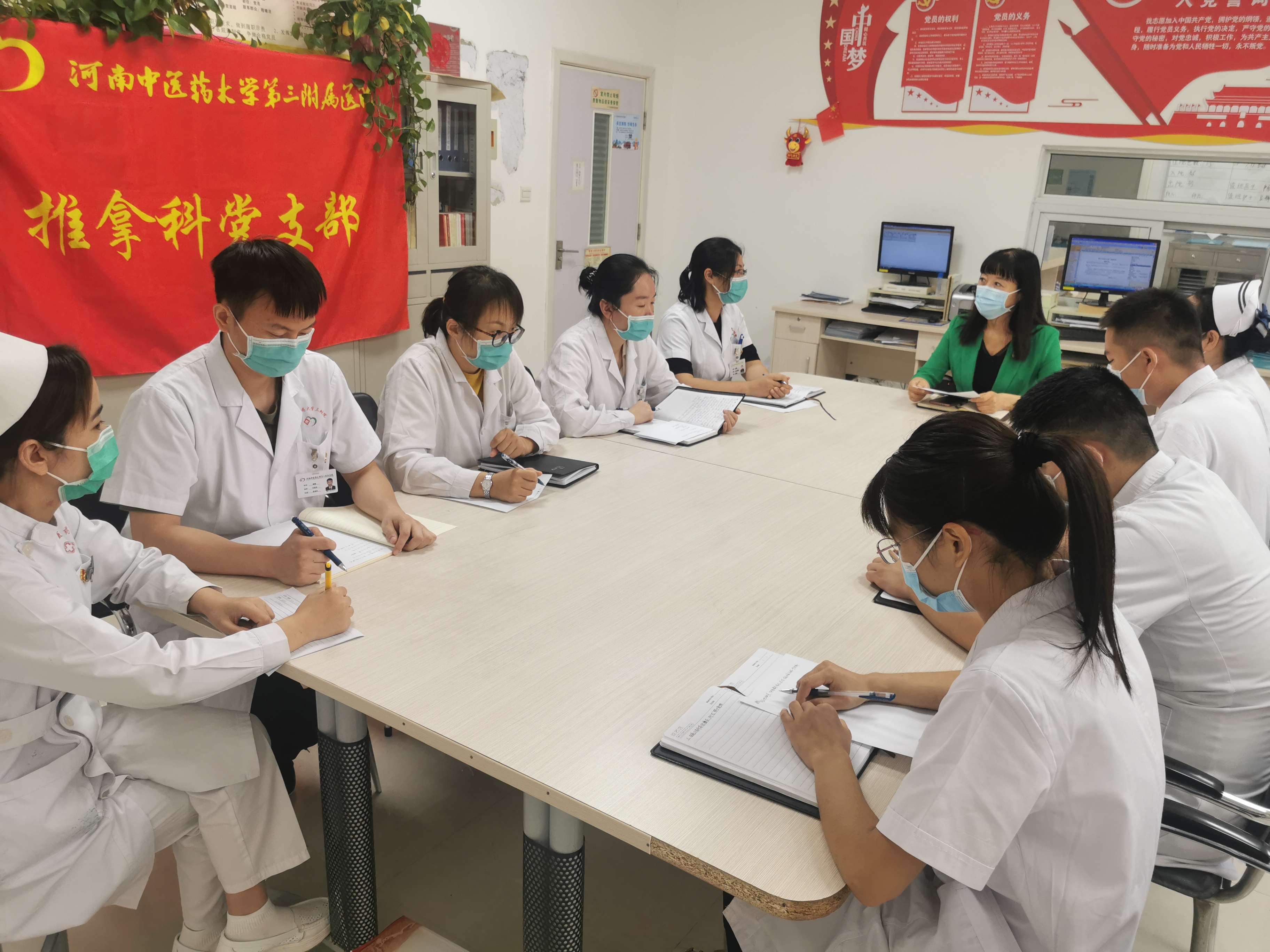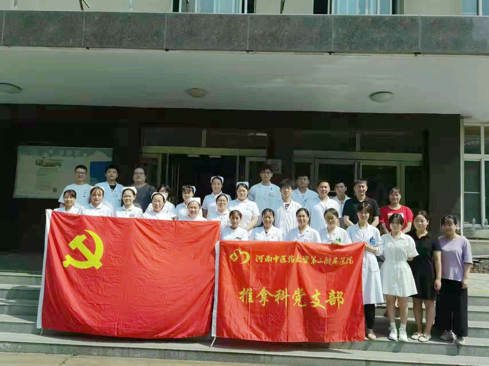 推拿科一病区党支部成立于2018年10月。党支部书记郭现辉担任了河南中医药大学第三附属医院推拿科主任、河南中医药大学针灸推拿学院推拿学科及推拿教研中心主任,符合“双带头人”要求。支部委员共7人,支部党员人数12人,正式党员11人,预备党员1人。围绕“七个有力”,蹄疾步稳提升党建质量:党支部教育党员有力。落实“三会一课”,学习教育常态化,规范化。因地制宜打造“特色课堂”。设立“流动课堂”,固定地点固定时间、随机学习、网络视频学习相结合的方式,推行“家庭课堂”,无法参加组织生活的党员,利用微信视频、语音连线参加学习,用活“掌上课堂”,利用学习强国、微信公众号、网上党建平台学习。每月相对固定1天开展主题党日活动,近三年推拿科完成基层义诊30余次,以医疗技术服务社会、回馈社会;开展科普讲座,提高群众健康意识。推拿科党支部截止目前,开展科普讲座30余次,变“组织群众来听”为“到群众中去讲”,将宣教送到患者及家属身边;党支部管理党员有力。支部党员在日常工作中佩戴党员徽章亮明身份、树立党员先锋岗,在医院 “人人是窗口”优质服务月活动中被评为“优秀团队”,立起先进标尺、树立先锋形象。落实“以学生为中心”的教育教学理念,校级课程思政项目获评“二等奖”;党支部监督党员有力。开展独具特色的“治未病”谈心谈话,支部书记和副书记之间、支部书记和其他党员之间,每年围绕党委重要部署、医院中心工作、支部和科室发展规划、党员廉洁自律等内容开展谈心谈话不少于1次;党支部组织师生有力。在 2020、2021年疫情期间,危难关头,全体党员做到了冲锋在前,让党旗在防控一线高高飘扬;党支部宣传师生有力。注重发现挖掘身边典型,2018年以来党支部有10人荣获市(校)级荣誉,16人荣获院级荣誉。支部书记郭现辉2019年荣获“河南中医药大学优秀党务工作者”,2019年8月荣获“河南省优秀教师”,2020年6月荣获“河南省高等学校优秀共产党员”,2021年10月荣获“河南省优秀教师”。2022年1月荣获“河南中医药大学第三附属医院我为群众办实事先进基层党组织”等荣誉称号。党员陈晓燕身患疾病仍长期带病工作,用身边人、身边事鼓励教育党员发挥先锋模范作用,形成争做先进、争当先进的浓厚氛围;党支部凝聚师生有力。教育引导党员、任课教师深入挖掘提炼各门课程中蕴含的思想政治教育元素,发挥“课程思政”育人功能,体现立德树人根本任务。把社会主义核心价值观贯穿师生专业课实践教学、社会实践活动、创新创业教育、志愿服务等过程,增强思想引领和价值观塑造的实效性;党支部服务师生有力。健全困难职工关心帮扶机制,把解决思想问题和解决实际问题相结合,制定帮扶标准,下沉基层,摸底排查,充分了解困难职工的实际需求,组建专业团队,有针对性的开展服务、帮扶、慰问等活动。如推拿科党支部多次参加金秋助学等活动。搭建交流平台,通过建立微信群、QQ 群等各种线上、线下沟通平台,丰富服务载体,及时了解、听取、回应职工意见和诉求,有力服务支部教职工。2020年6月荣获“河南中医药大学先进基层党组织”,2020年7月获批“全校党建工作样板支部”,2021年2月获批“全省党建工作样板支部”,2021年6月荣获“河南中医药大学先进基层党组织”“河南省高校先进基层党组织”。