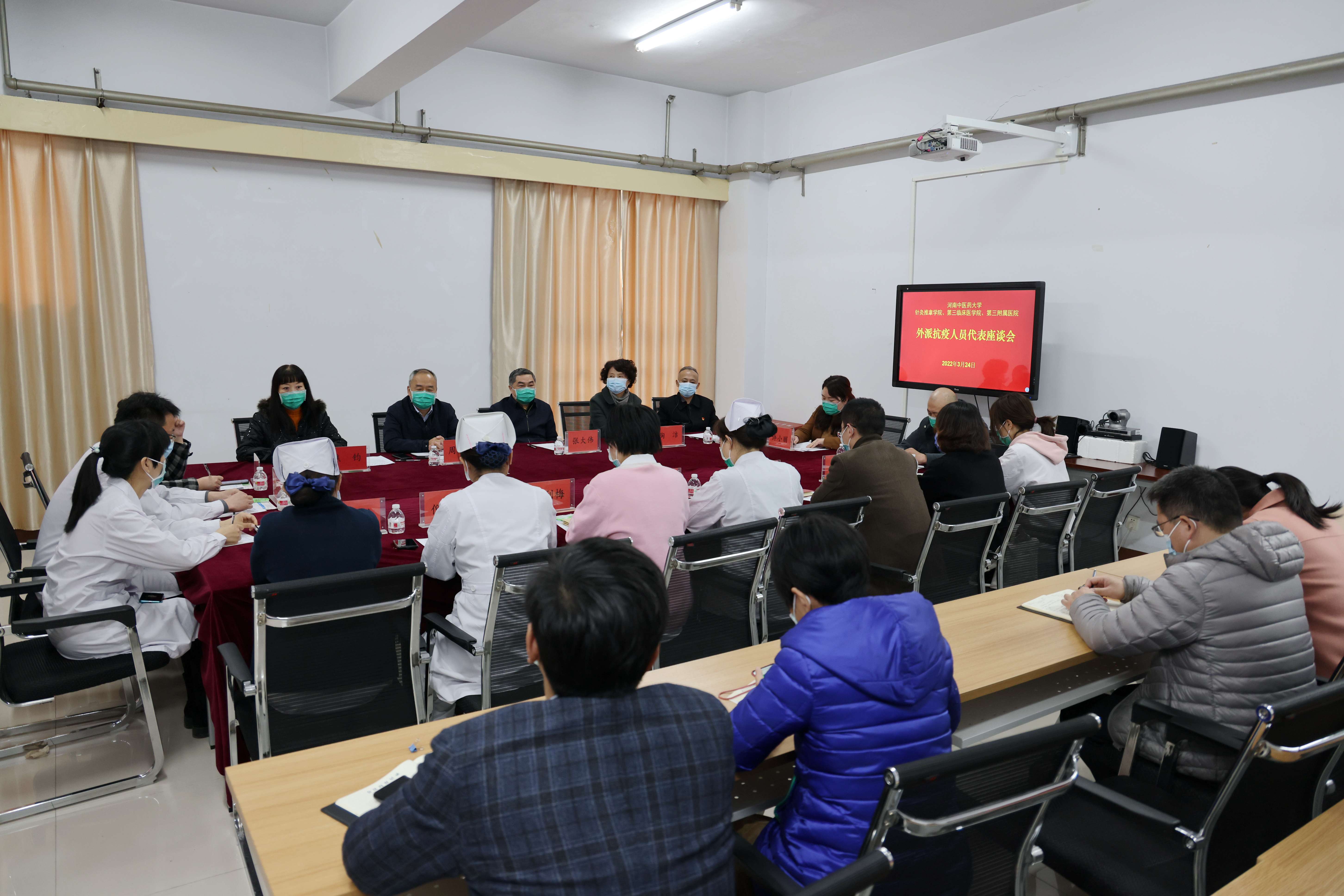 本网讯(通讯员胡兴旺)为贯彻落实中共中央政治局常务委员会、省委常委会议精神,落实省委书记楼阳生在视频调度太康县疫情防控工作时重要讲话精神,切实把校党委的防疫部署抓细抓实,把疫情防控工作作为能力作风建设的重要战场、重大考验,进一步总结抗疫经验做法,完成好上级安排的各项抗疫任务,2022年3月25日,我院党委召开“外派抗疫代表座谈会”。党委书记周运峰、院长张大伟、党委副书记焦钧、副院长王志超参加会议。我院外派岐伯山医院、郑州市第一人民医院航空港院区、国务院联防联控机制医疗救治组、金水区密接人群集中隔离点等14位医护人员代表参加了会议。党委办公室、院长办公室、人力资源部、医务部、护理部、工会等相关职能部门负责人列席了会议。焦钧主持会议。