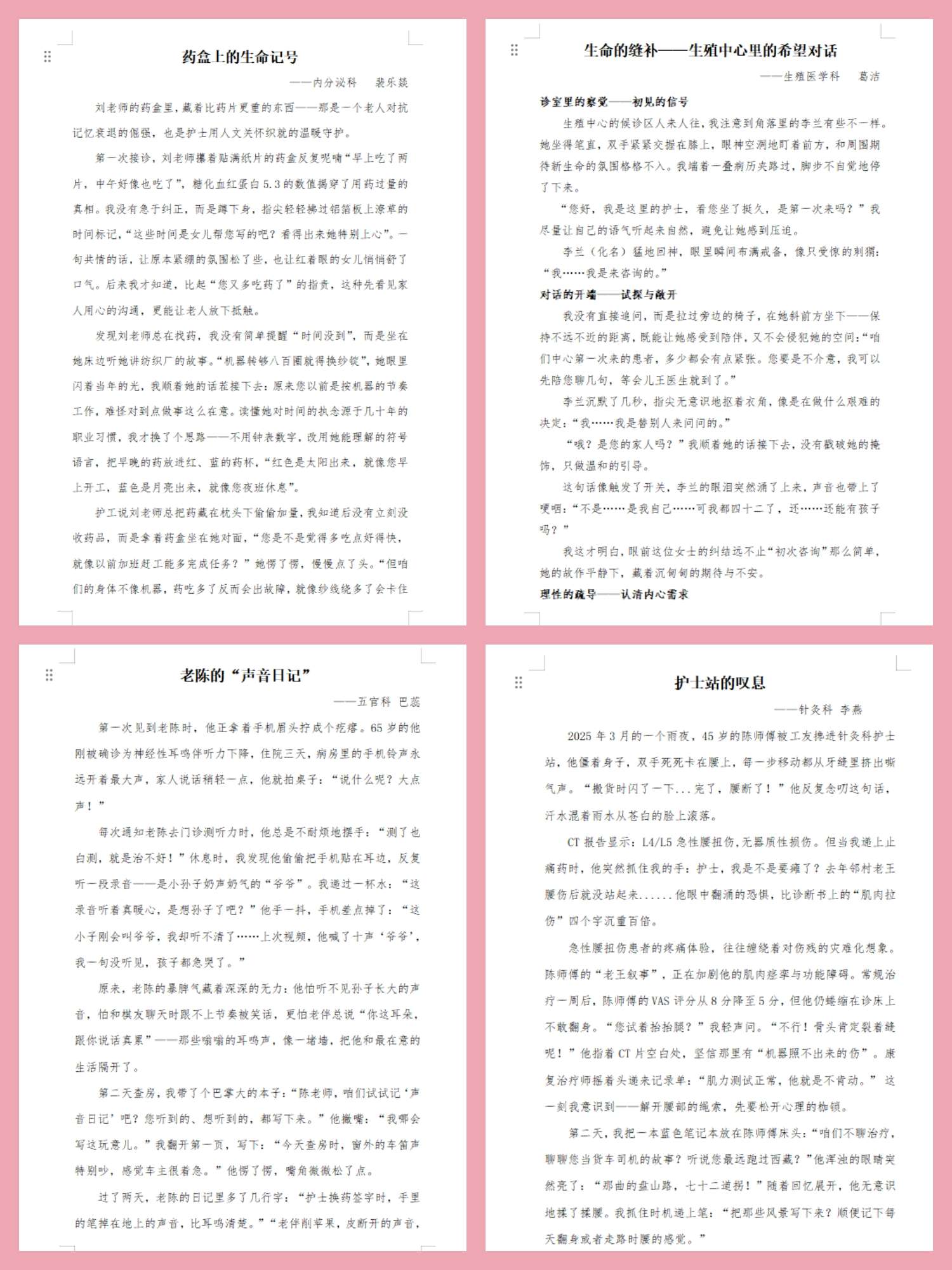 经过评审,裴乐燚等12人的文章及骨伤科等10个科室的视频作品分别获奖。这些作品真实记录了护患之间的温暖互动,体现了叙事护理融入临床实践后,对促进患者心理康复、提升整体照护质量的积极意义,充分展现了我院护理团队在提供专业照护的同时,对患者心理与情绪状态的敏锐觉察与主动关怀。