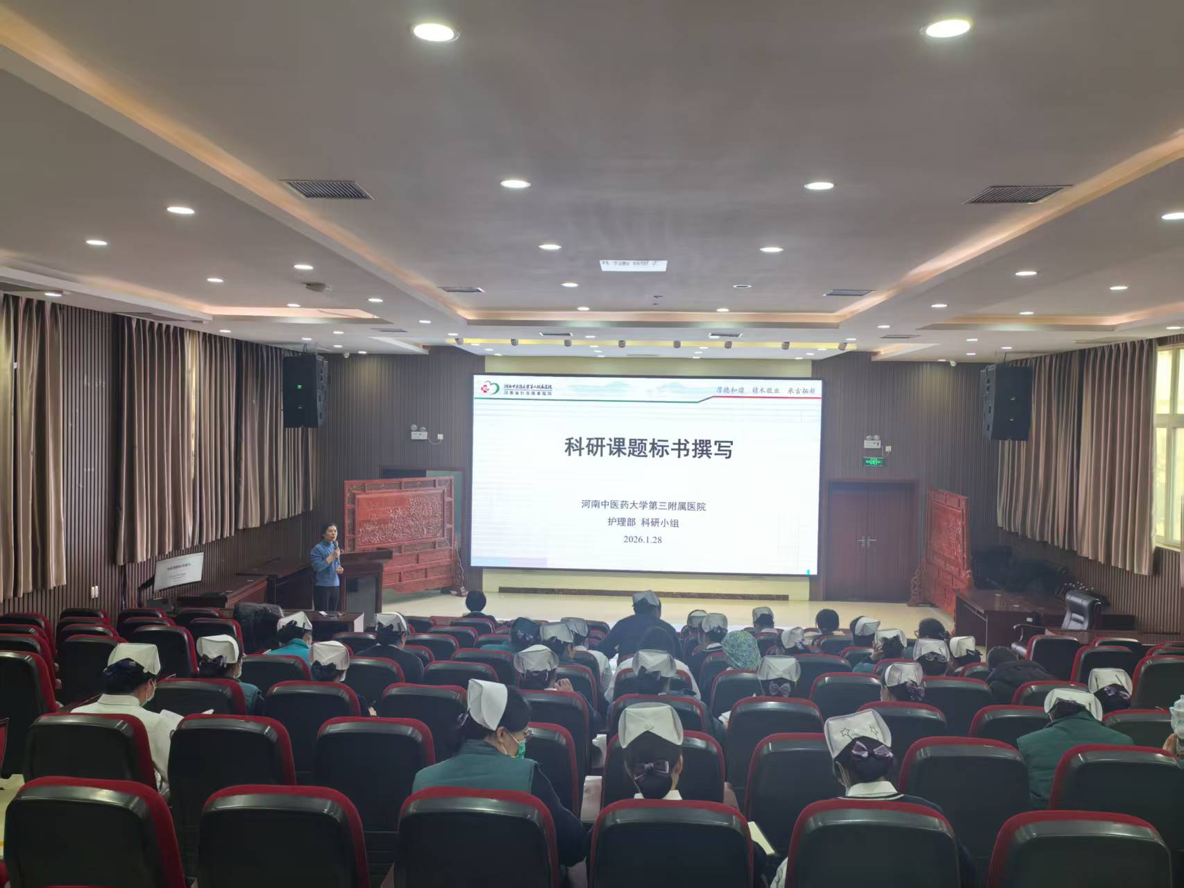 本网讯(文 翟晓静/图 李丽)为进一步提升全院护理人员的科研素养与创新能力,推动护理学科的高质量发展,2026年1月28日下午16点,我院护理部联合护理科研小组在学术中心二楼成功举办了《课题标书撰写》专项培训会。此次培训不仅标志着今年护理科研能力提升计划的全面启动,更传递出护理部将通过“一对一”精准帮扶机制,切实提升各科室标书撰写质量与申请成功率的信心和决心。
