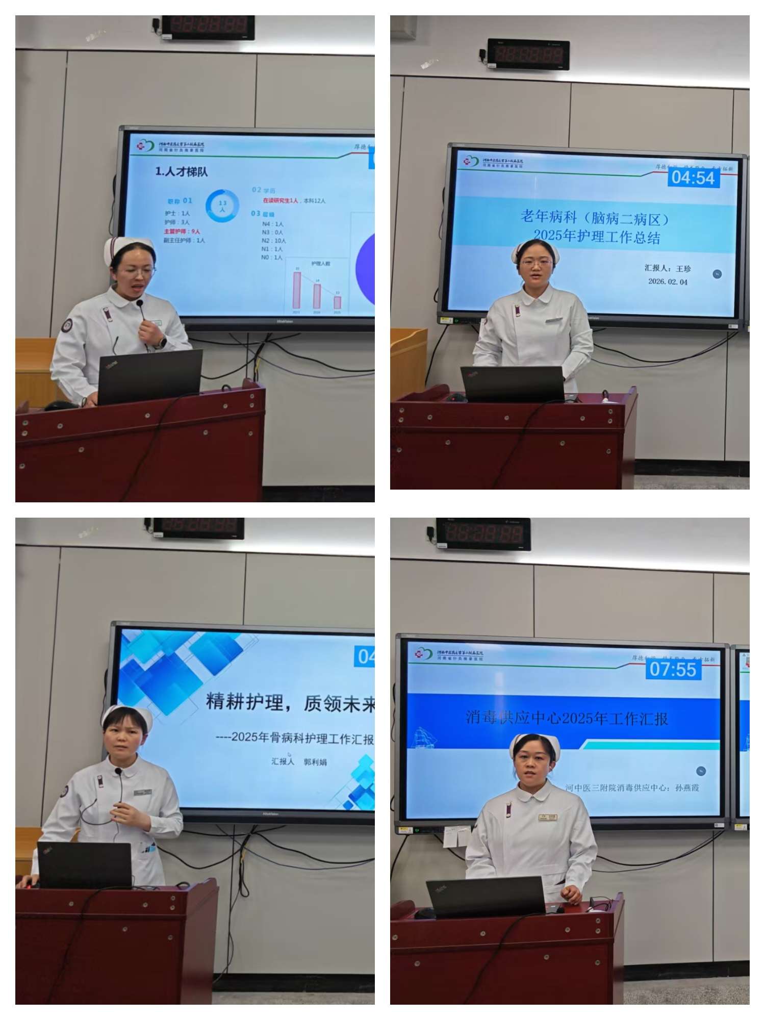 会上,37名护士长围绕2025年度护理管理、质量安全、服务创新、团队建设等内容进行汇报,客观总结成效、剖析存在问题,并阐述2026年重点工作计划。静脉治疗、糖尿病、火龙罐等18个专科小组组长也分别就培训开展、质控管理、学术交流等方面进行总结,明确新一年专科发展重点。
