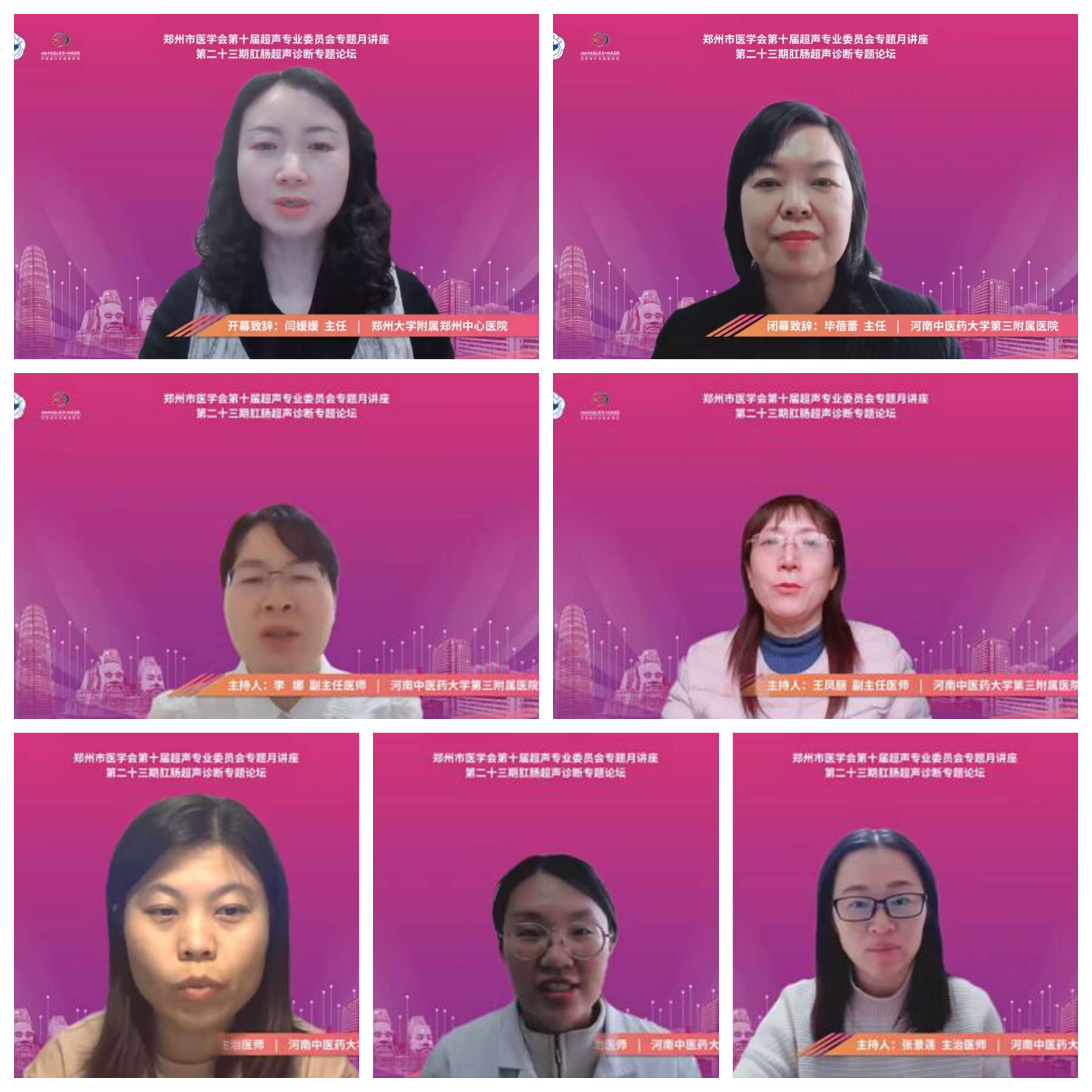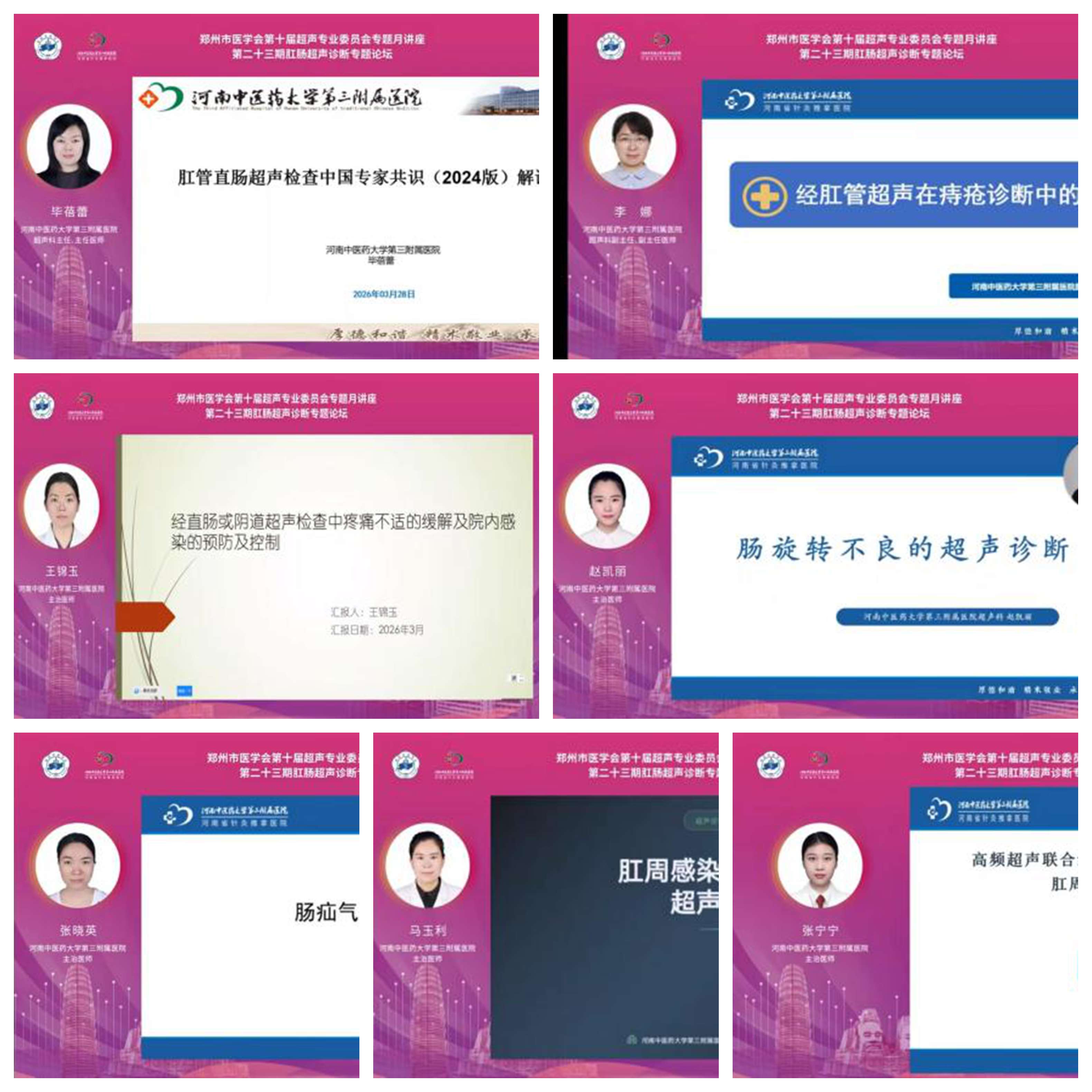 本网讯(通讯员毕蓓蕾) 为进一步提升肛管直肠疾病诊疗水平,推广超声检查技术在肛管直肠领域的规范化应用, 2026年3月28日,由郑州市医学会主办、我院承办的第十届超声专业委员会专题月讲座(第二十三期)肛管直肠超声诊断专题论坛通过线上平台直播方式成功举办,省市各级医疗单位超声专业及临床医师参会,累计观看人数达 2.3万人次。超声科主任毕蓓蕾主持开闭幕式。