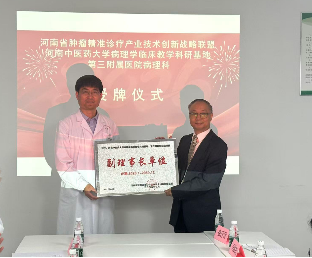授牌学术交流本网讯(通讯员苏丹华)2026年4月14日,河南省肿瘤精准诊疗产业技术创新战略联盟理事长、河南省核蛋白医学检测工程技术研究中心主任姬新颖教授携团队核心成员徐海英主任,河...